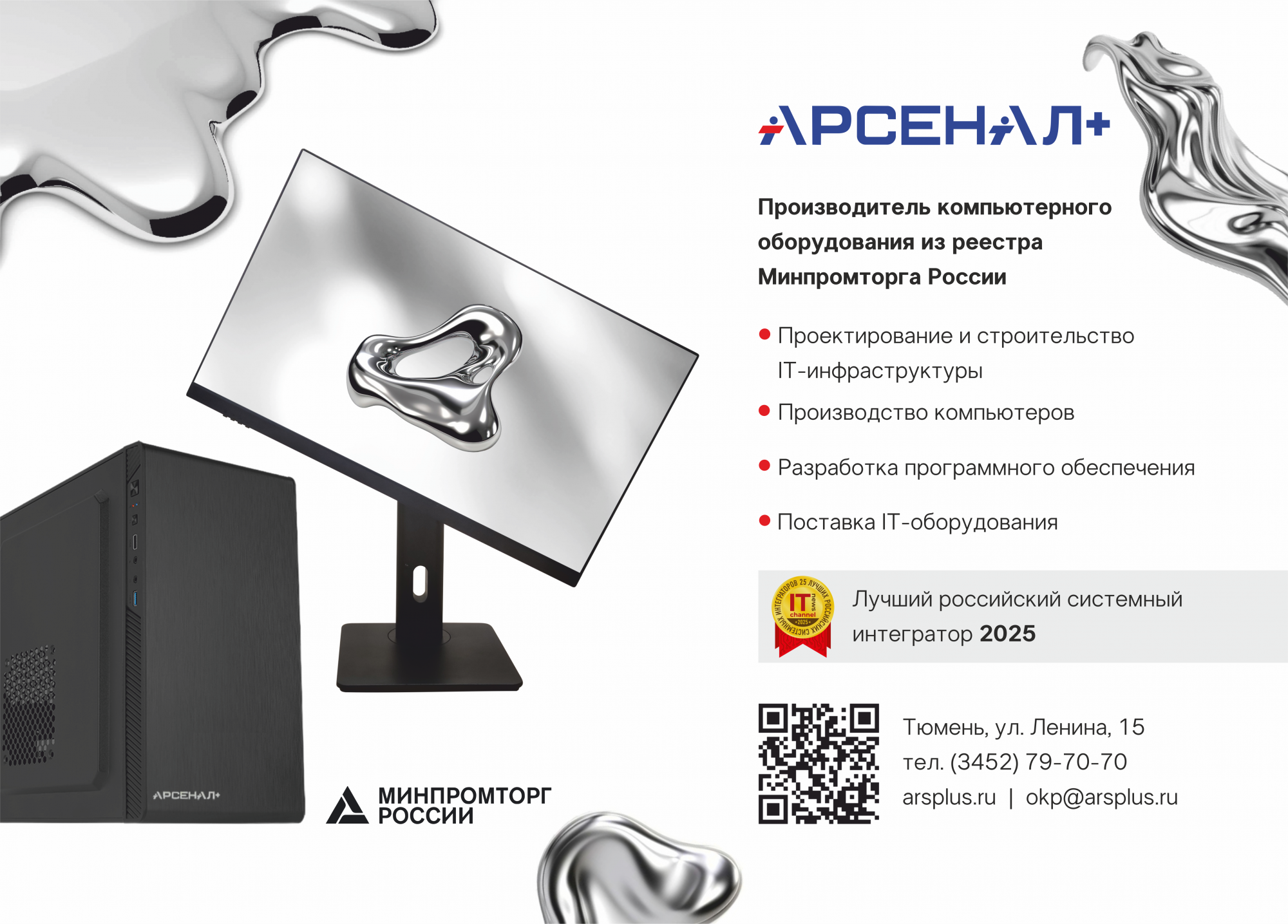 «Арсенал+» - системный интегратор полного цикла. Ведущий производитель компьютерного оборудования в Тюменской области. Эксперт в области ИТ-инфраструктуры, внедрении информационных систем и создании программных решений.