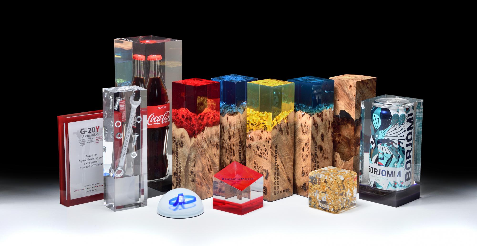 Мы производим призы, кубки, награды на заказ из стекла, дерева, акрила, металла и полимерной смолы. Создаём выставочные объекты через заливку предметов в полимерную смолу высокой чистоты и прозрачности для производств.