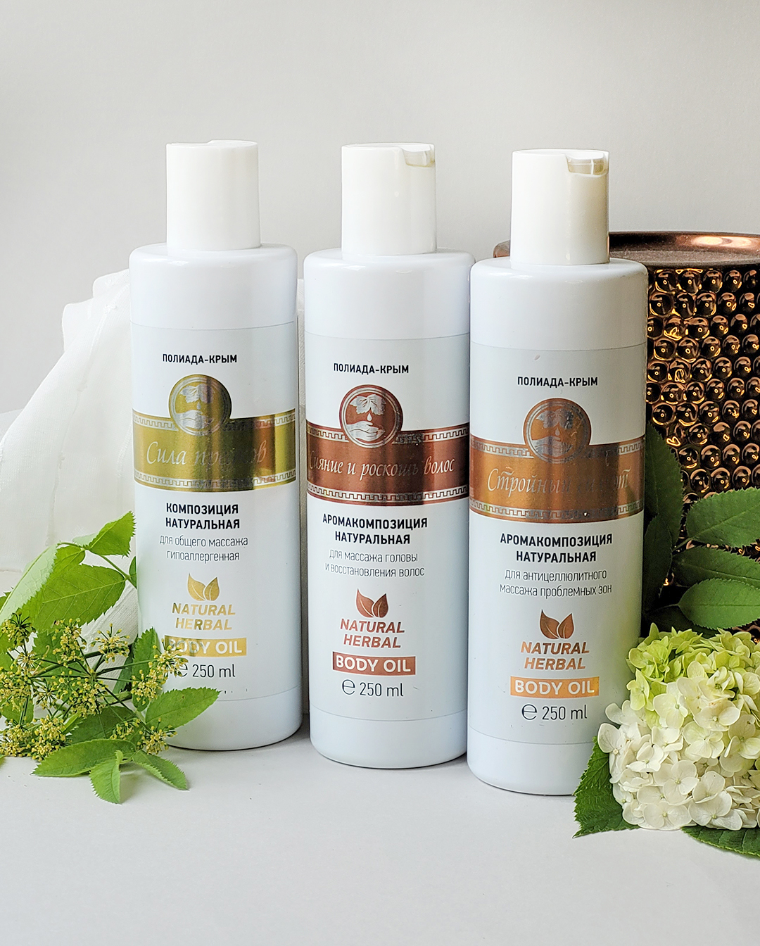 В ассортимент продукции «Полиада-Крым» так же входит целый ряд средств на их основе гидролатов и эфирных масел, которые имеют широкий спектр косметического и лечебного действия: это шампуни и гели для душа, массажные композиции, аромаспреи для помещений, дезодоранты, уходовая косметика для тела.