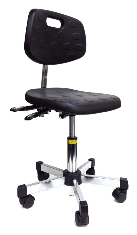 Вспененный полиуретан. Высота регулировки: 430~570 мм. Размер сиденья: 410x390 мм. Размер спинки: 380x250 мм. Регулировка сиденья вверх и вниз, регулировка спинки по высоте, регулировка угла наклона спинки. 5-ти лучевое основание без сварки из холоднокатаной стали с покрытием, диаметр 520 мм; 5 антистатических колес (нейлон). Антистатическое исполнение: поверхностное и объемное сопротивление 10Е5-10Е8 Ом. Цвет черный.