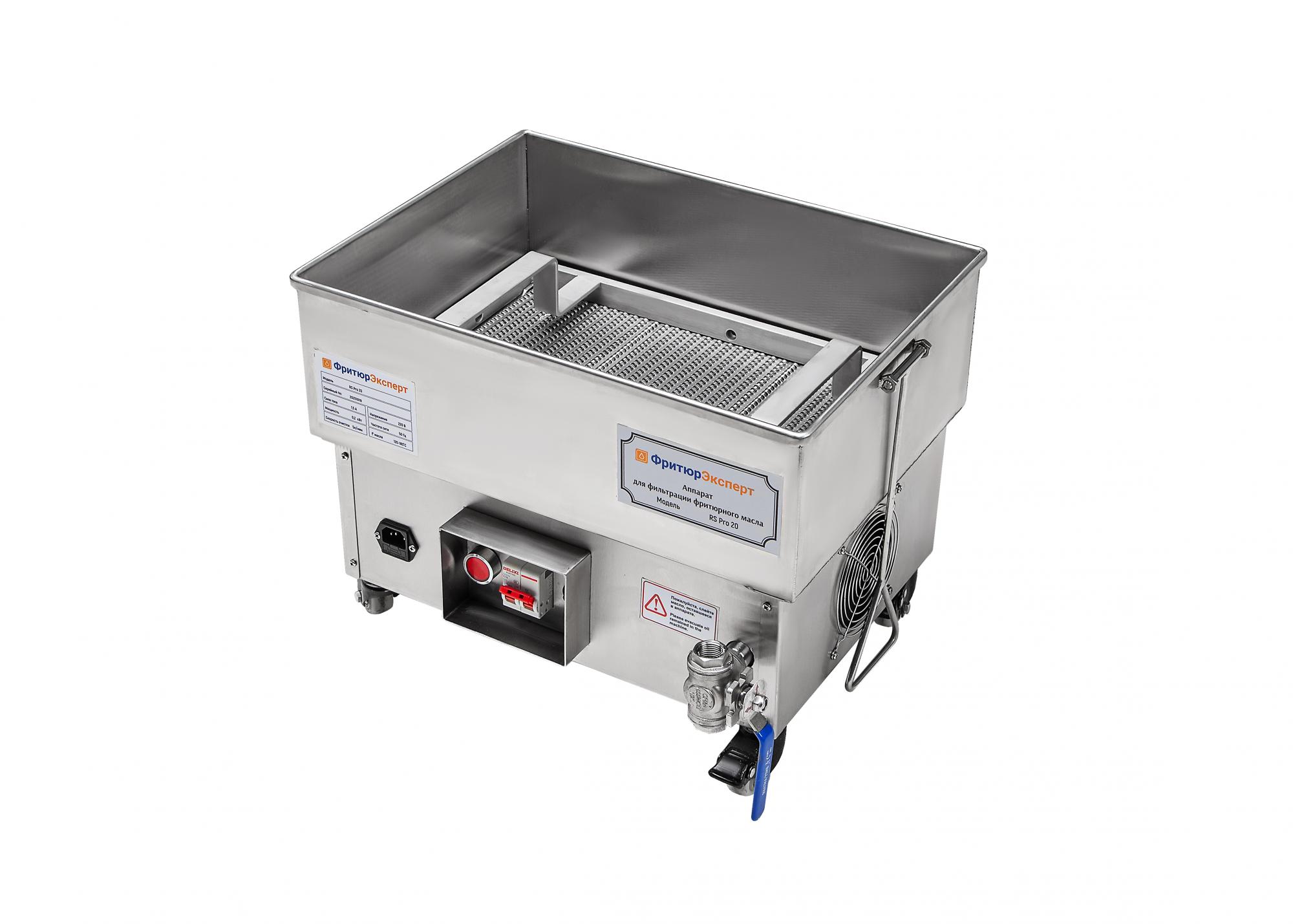 Аппарат для очистки фритюрного масла RS PRO 20 чистит до 20 литров масла из одной или нескольких фритюрниц за 10 минут. Масло предварительно необходимо слить из фритюра в аппарат для очистки, обратно оно заливается через шланг с встроенным насосом.