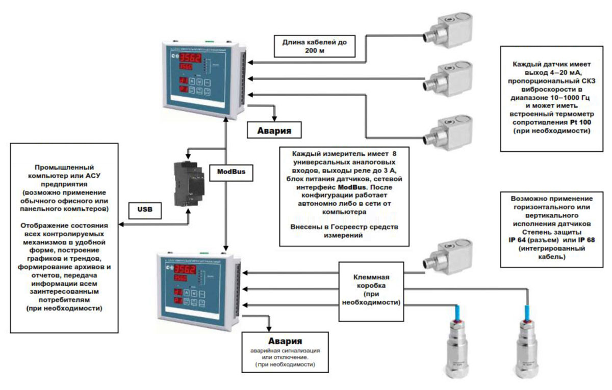 Обеспечивает измерение параметров вибрации и температуры, их сравнение с заданными уставками и передачу измерительных данных в информационную компьютерную сеть (протокол ModBus).