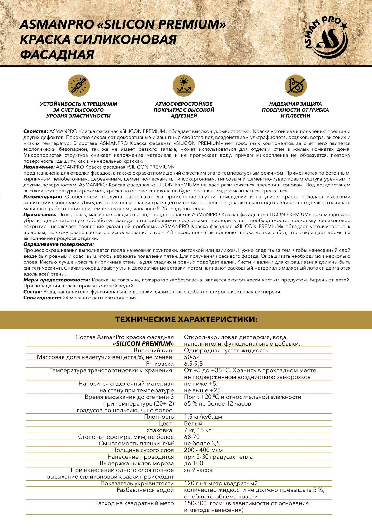 Свойства: ASMANPRO Краска фасадная SILICON PREMIUM обладает высокой...