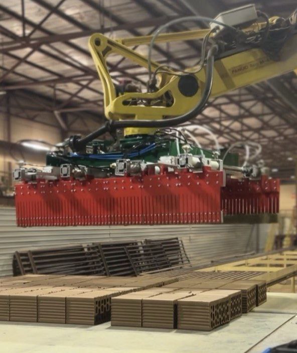 Надежное удержание: параллельные губки с пневмоцилиндрами обеспечивают крепкий захват кирпича, гарантируя безопасность перемещения