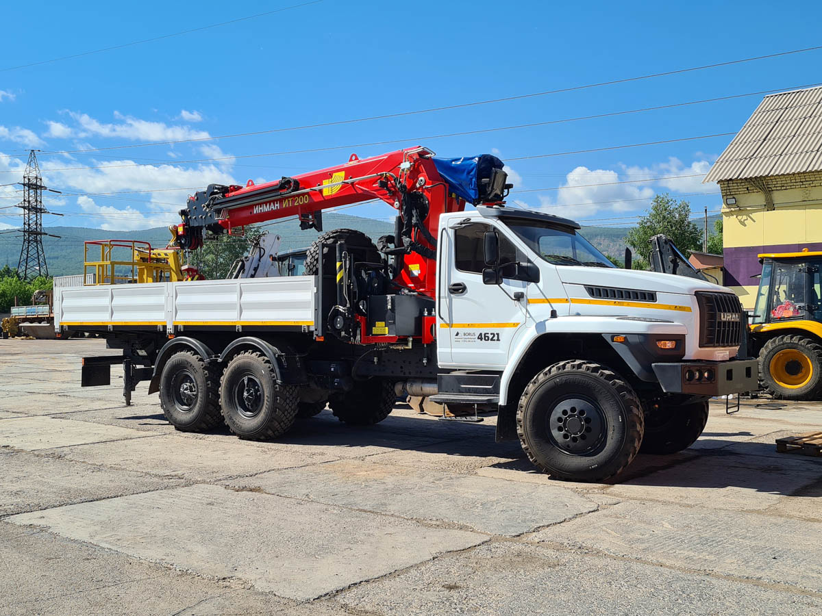 Бортовой автомобиль с КМУ Инман ИТ-200 и сертифицированной люлькой на шасси УРАЛ NEXT 6х6. Грузоподъемность КМУ 7200 кг. Грузовой момент 21 тм. Максимальный вылет стрелы 18,9 м. Управление с сиденья. Опоры поворотные / не поворотные (в зависимости от комплектации). Габариты бортовой платформы 6000х2500х600 мм. Задние аутригеры. Гидролиния. Сертифицированная люлька. Возможность установки бура (опция).