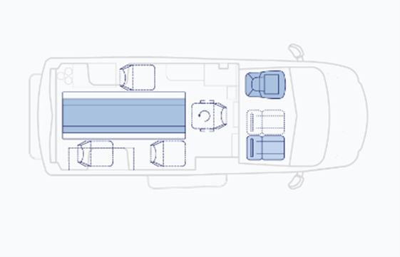 Кабина водителя: кресло водителя, кресло сопровождающего одиночное Кресло по правому борту медицинского салона с возможностью установки дополнительных носилок, с ремнем безопасности, складное. Кресло поворотное в головной части носилок с ремнем безопасности и откидными подлокотниками. Скамья-рундук по правому борту салона (с фиксатором для установки дополнительных носилок).