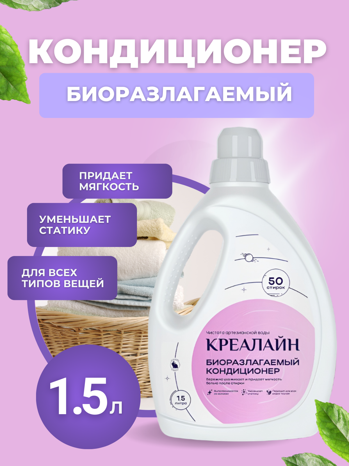 Кондиционер для белья Креалайн придаёт белью мягкость и воздушную свежесть, защищает от образования катышек, потери формы и вымывания цвета. Средство обеспечивает деликатный уход за бельём в процессе полоскания в стиральных машинах-автоматах всех типов и при ручной стирке. Обладает антистатическим эффектом. Смягчает глаженье. Экономичен в использовании. Подходит для всех видов тканей, сохраняет их структуру и устраняет неприятные запахи.
