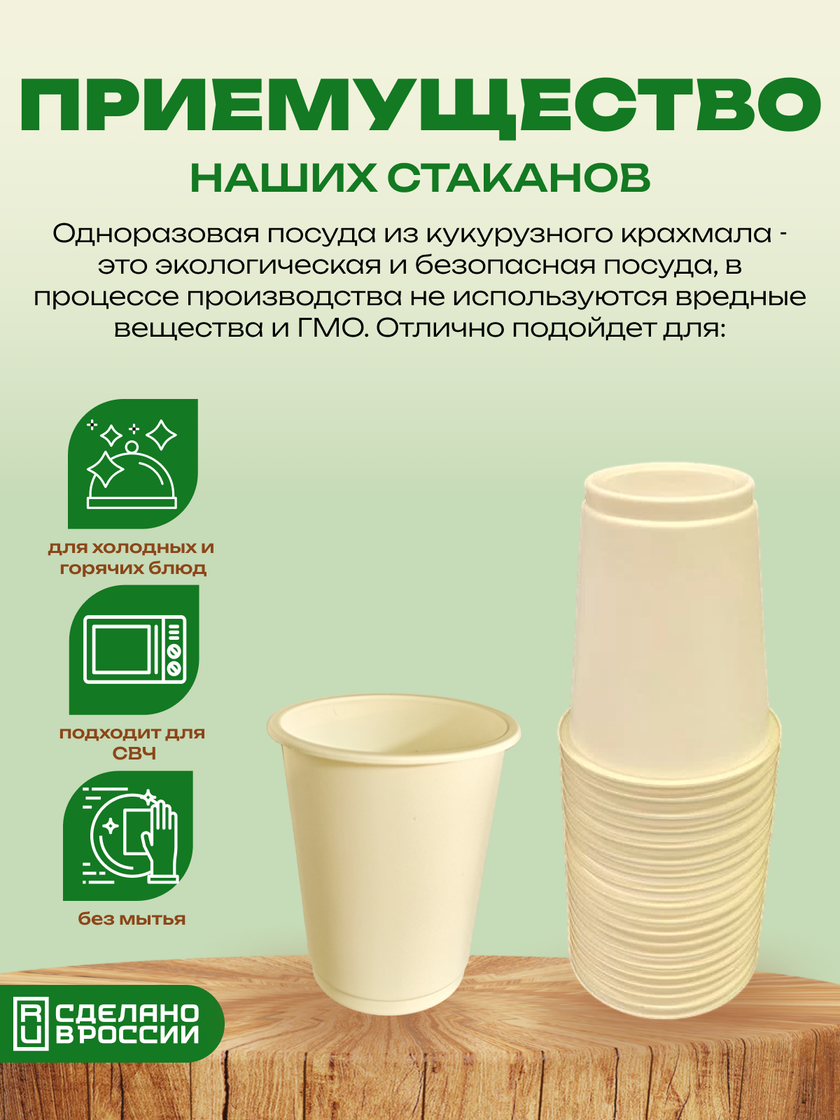 Биоразлагаемые стаканы из крахмала. Изготовленные из натуральных материалов, они не наносят вреда нашей планете и являются отличным выбором для тех, кто ценит экологически чистые решения. Имеют оригинальный дизайн, который выделяется среди других видов посуды. Они идеально подходят для любых блюд - от салатов до горячих блюд. Отличительная черта этих стаканов - их прочность, несмотря на то, что они разлагаются в окружающей среде.