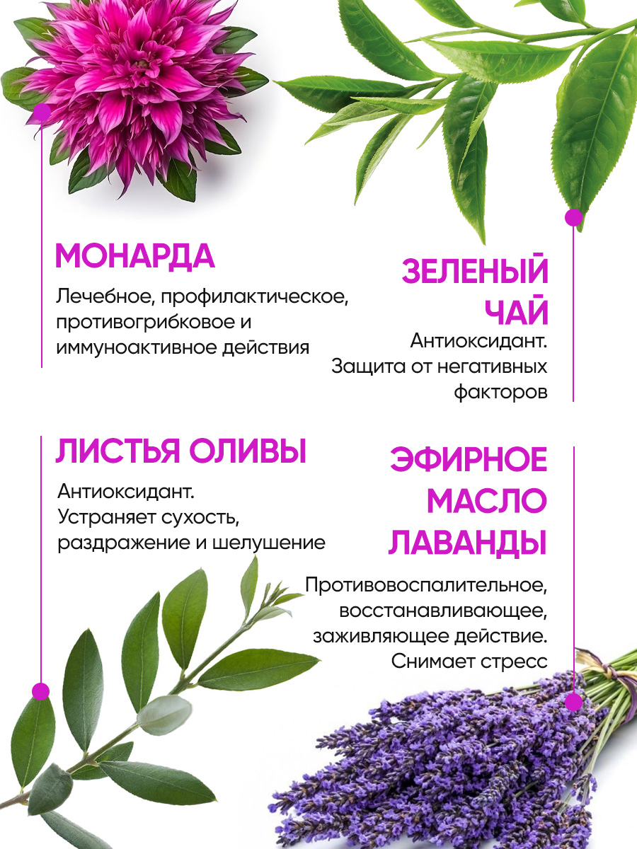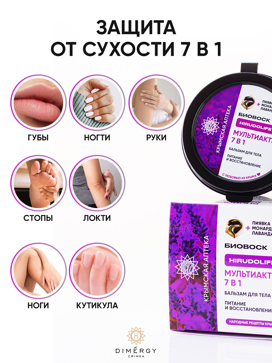 Биовоск “Мультиактив 7 в 1” с экстрактом монарды подходит для многофункционального ухода за очень сухими участками кожи. Питает и увлажняет губы, ухаживает за ногтевой пластиной, смягчает кутикулу, восстанавливает кожу рук и ног, заботится о коже на локтях. Экстракт монарды оказывает лечебное, профилактическое противогрибковое и иммуноактивное действие, восстанавливает поврежденную кожу, устраняет сухость. Экстракты зеленого чая и листьев оливы оказывают антиоксидантное действие, устраняют сухость, раздражение и шелушение, защищают кожу от негативного воздействия окружающей среды. Эфирное масло лаванды оказывает противовоспалительное, восстанавливающее и заживляющее действие, успокаивает кожу. Аромат лаванды положительно влияет на нервную систему, успокаивает и снимает стресс.