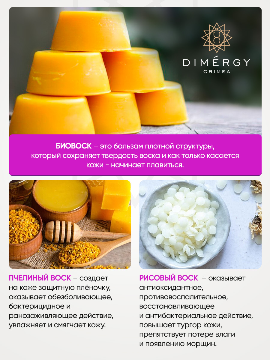 Биовоск – специально разработанный косметический бальзам плотной структуры, который сохраняет твердость воска и как только касается кожи - начинает плавиться. В нем максимально раскрыты целебные свойства пчелиного воска и воска рисовых отрубей, а действие усилено другими активными компонентами.