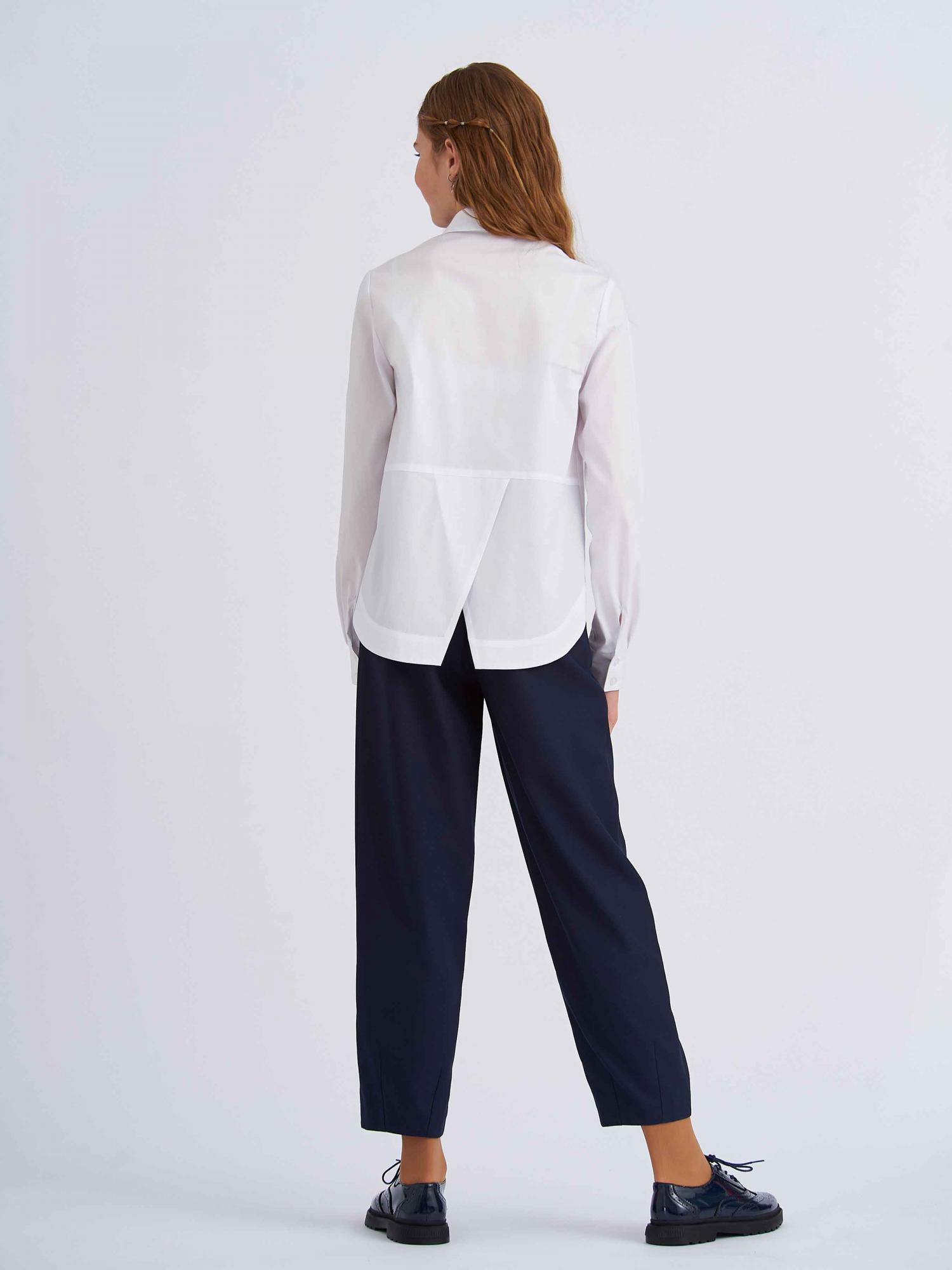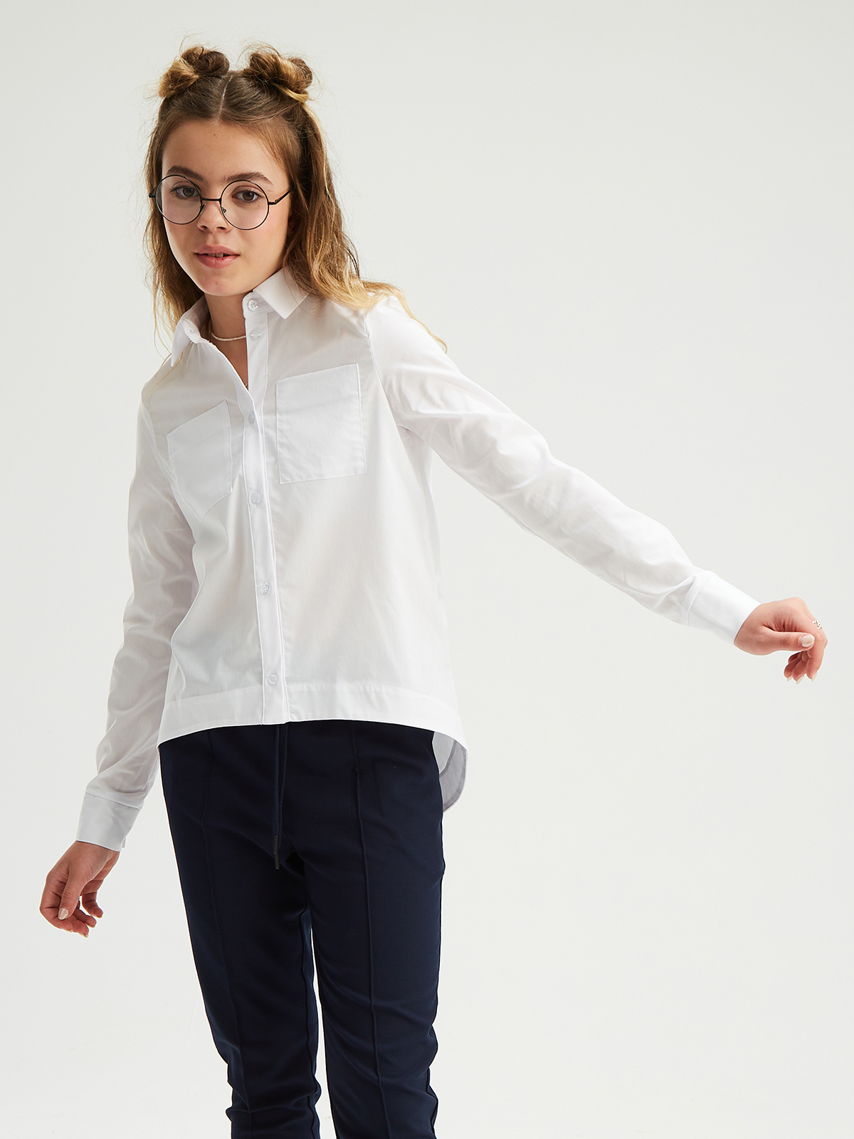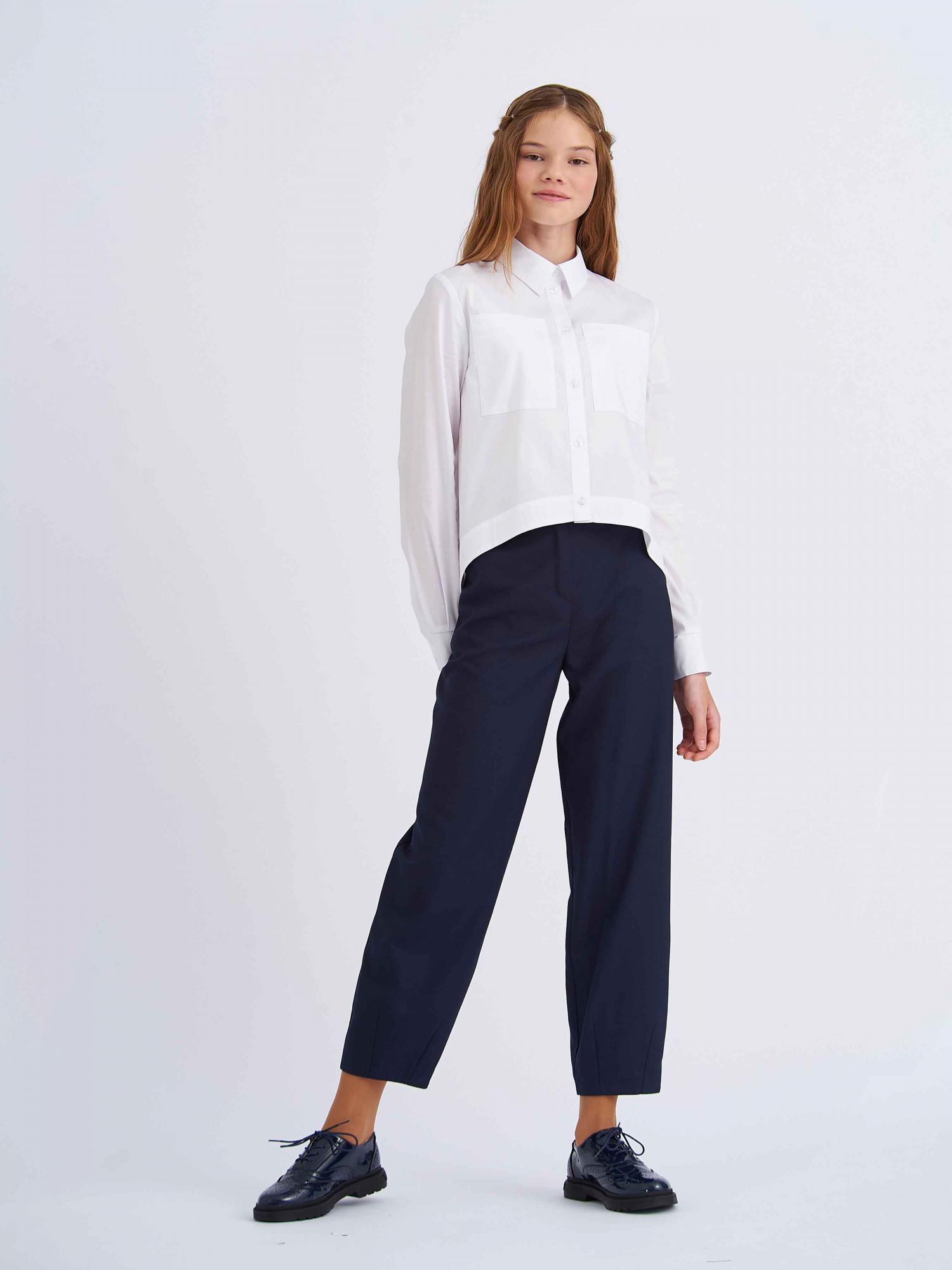 Свободная блузка для подростков из смесового хлопка с отложным воротником со стойкой и длинными рукавами на манжете. Высокое содержание хлопка в составе обеспечивает отличную воздухопроницаемость и комфорт в повседневной носке. Передняя часть укороченная. На полочке расположены два накладных кармана. Спинка удлинённая с фигурным низом и запахом из под линии кокетки. Застежка на планку с пуговицами. Блузка будет прекрасным дополнением к моделям из школьной коллекции SMENA, отличный вариант на каждый день.