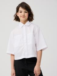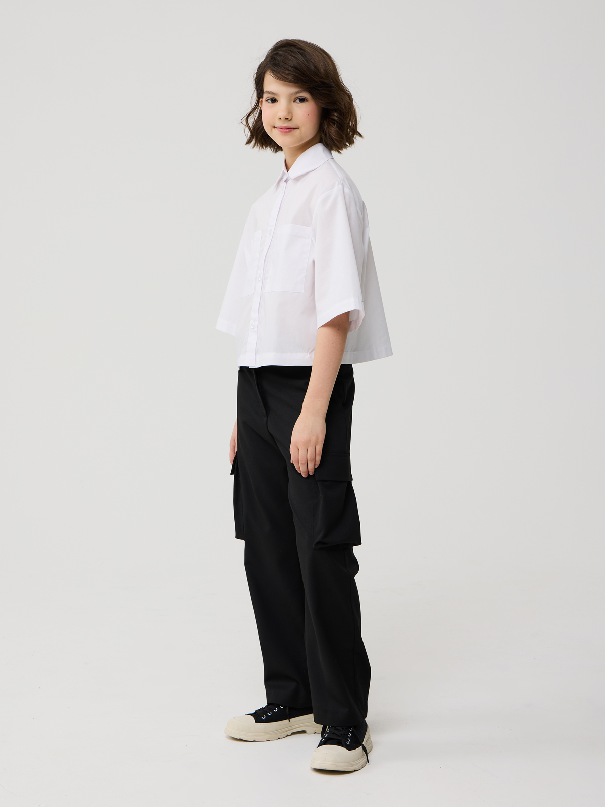 Укороченная блузка свободного силуэта для подростков из смесового хлопка с отложным воротником со стойкой и короткими свободными рукавами. На полочках расположены 2 накладных кармана. Застежка на планку с пуговицами. Высокое содержание хлопка в составе обеспечивает отличную воздухопроницаемость и комфорт в повседневной носке