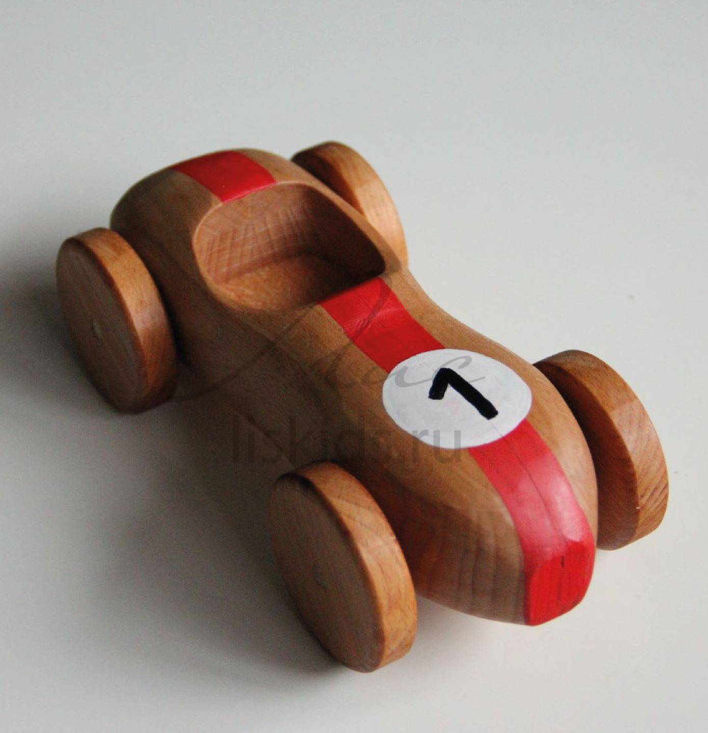 Цветные элементы игрушки – красная полоса на кузове и цифра «1» – нарисованы абсолютно безопасными для детей акриловыми красками.