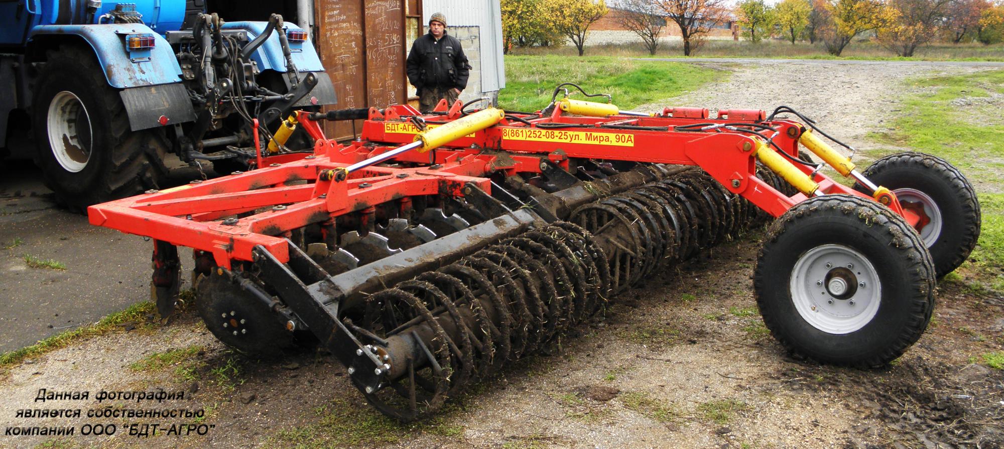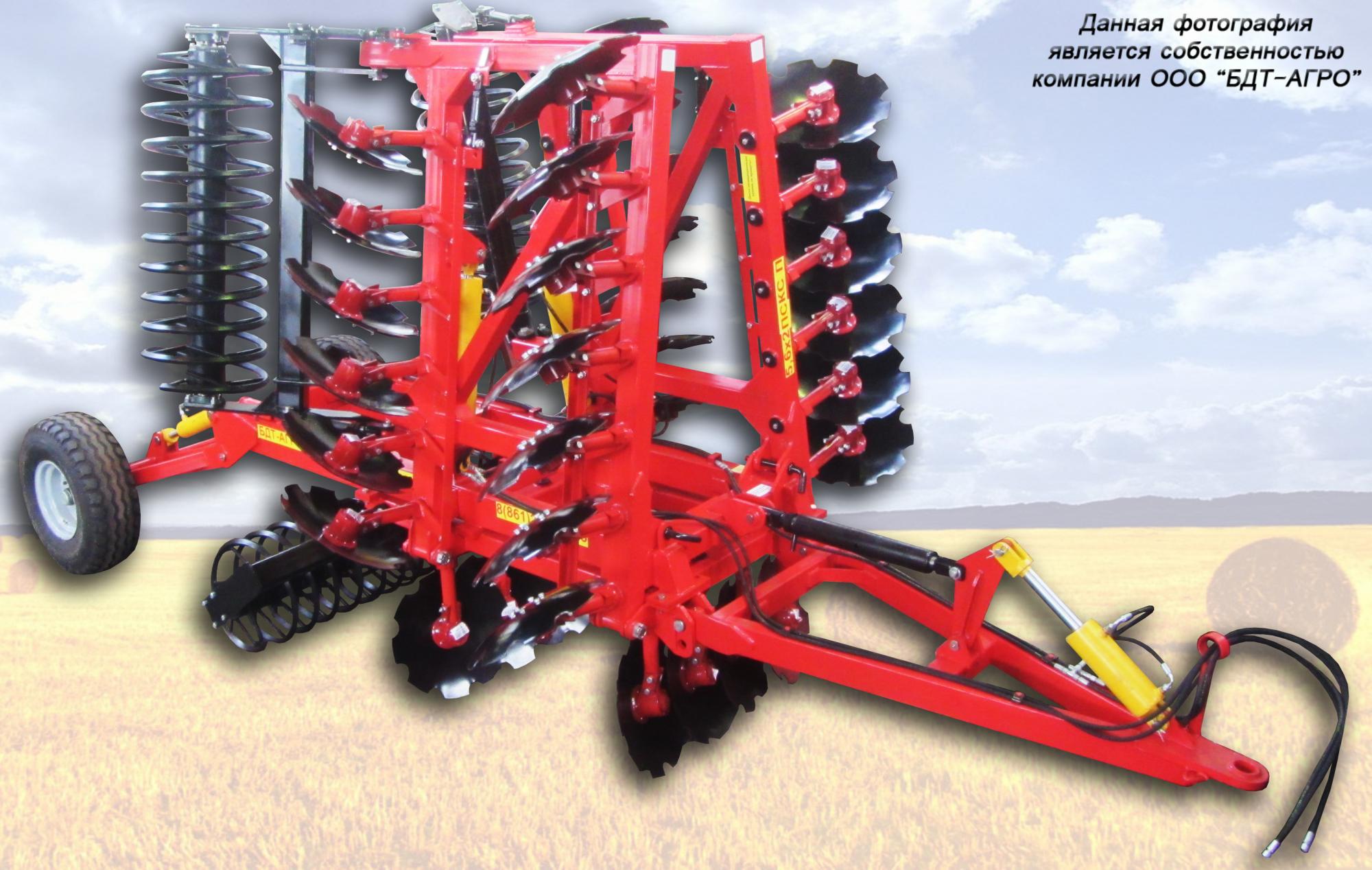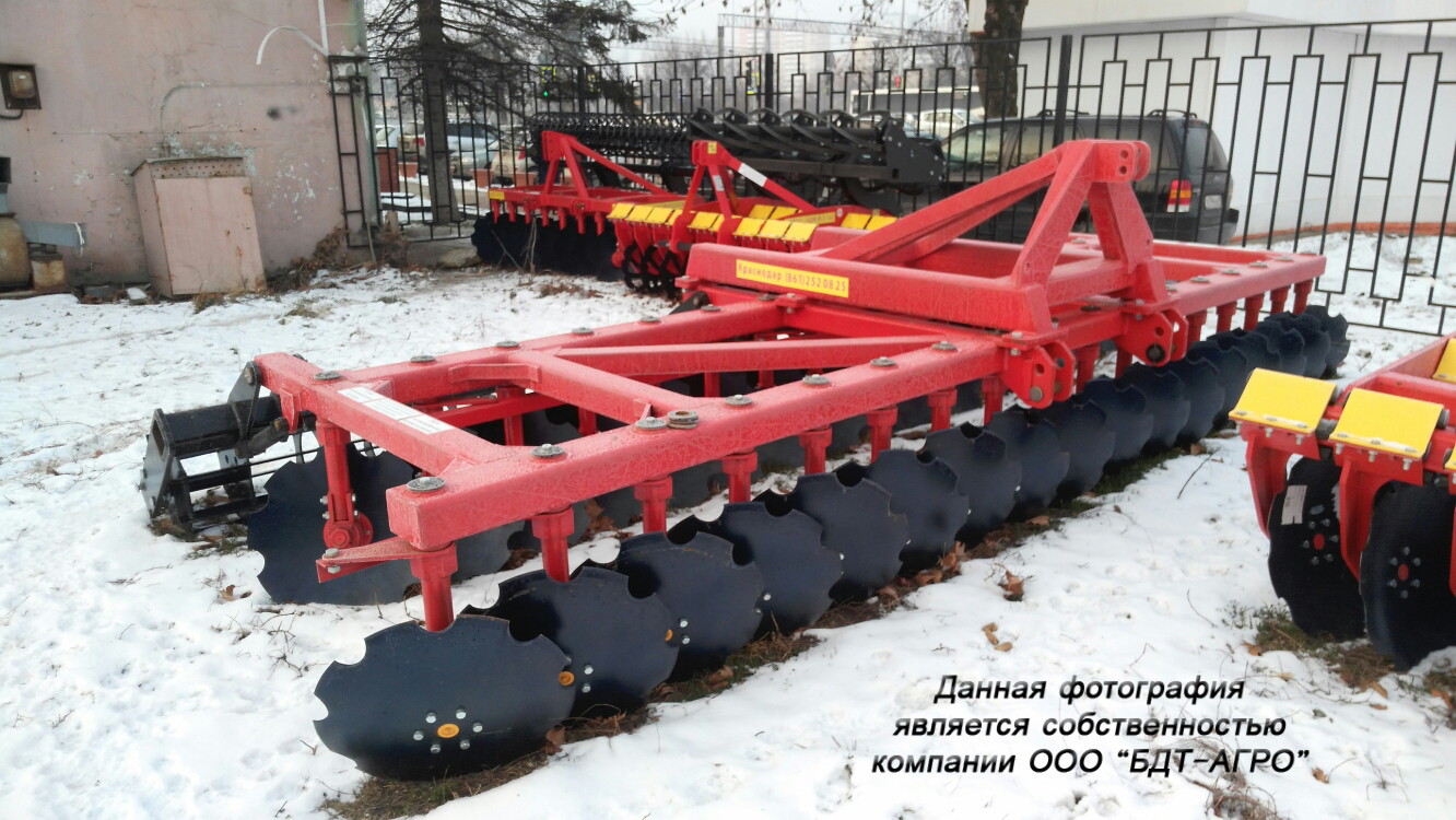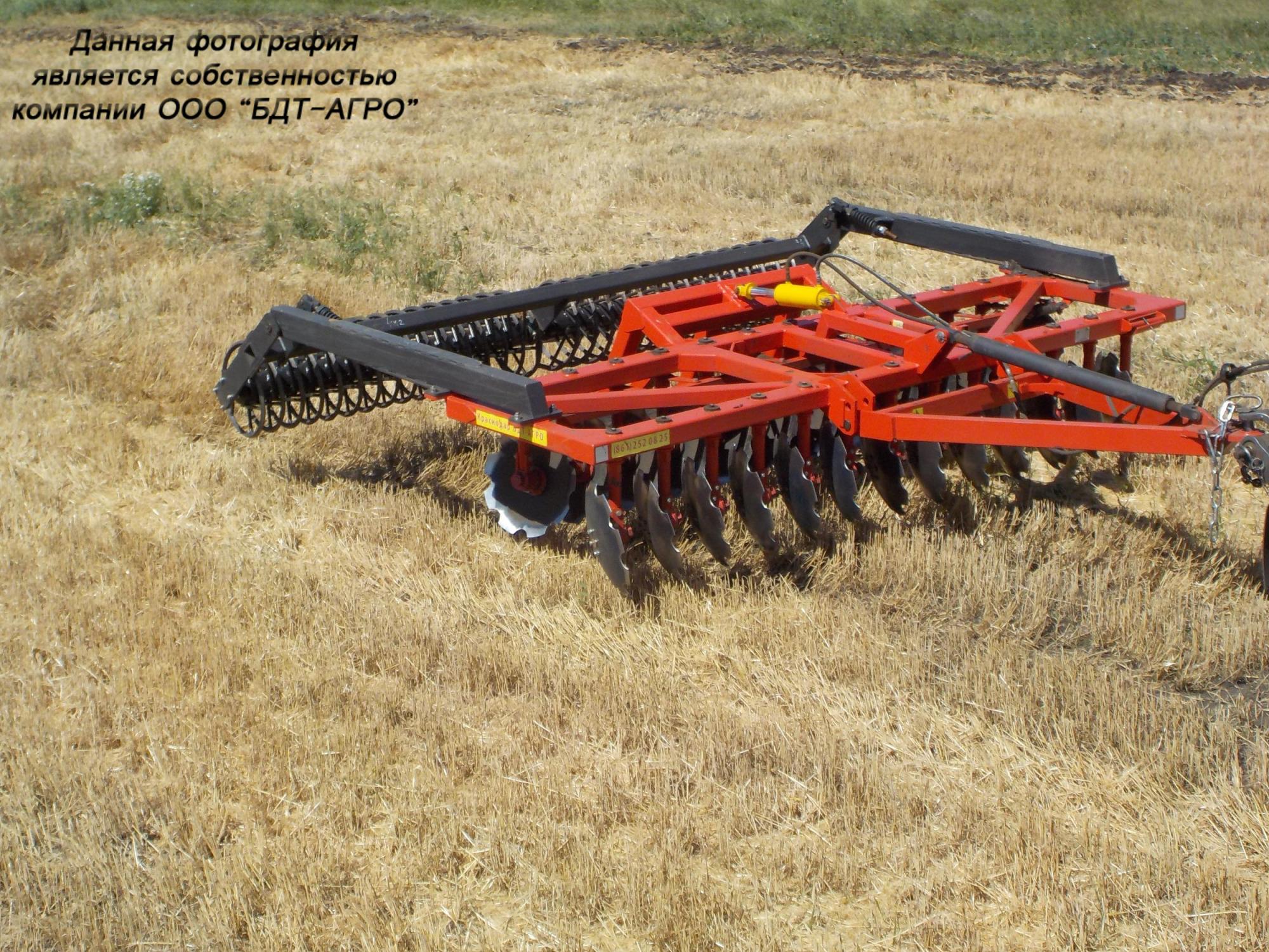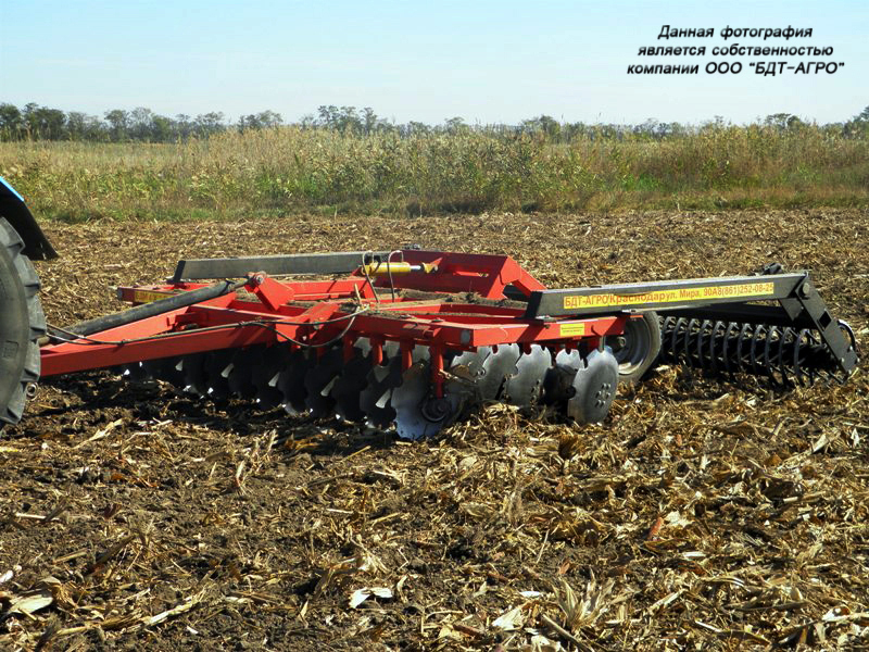 Двухрядная борона дисковая модернизированная БДМ с подшипниковым узлом внутри сферы диска, с дисками на индивидуальной стойке, с изменением угла атаки дисков синхронно в каждом ряду, предназначена для поверхностной обработки почвы на глубину до 15см, уничтожения сорняков и измельчения пожнивных остатков. За счет равномерного перемешивания земли с растительными остатками эффективно применение бороны дисковой на почвах подверженных ветровой и водной эрозии. Растительные остатки, равномерно перемешанные с верхним слоем почвы, защищают почву от выдувания и вымывания, улучшают воздушный обмен. При этом растительные остатки, находясь в земле, активно превращаются в перегной, повышая плодородие почвы.