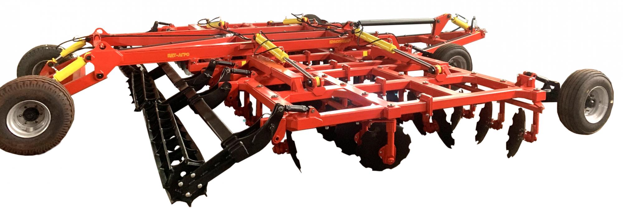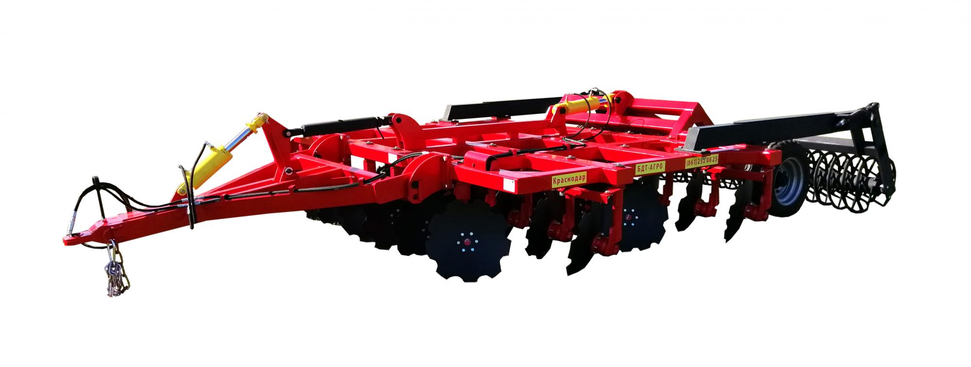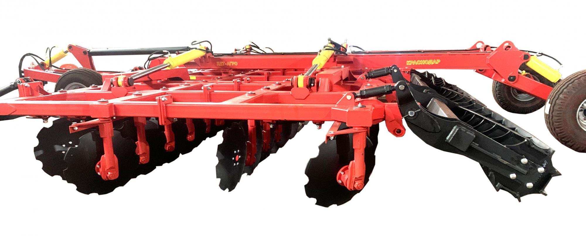 Четырехрядная борона дисковая модернизированная БДМ-А с подшипниковым узлом снаружи сферы диска, с дисками на индивидуальной стойке, с изменением угла атаки дисков синхронно в каждом ряду, предназначена для поверхностной обработки почвы на глубину до 17см, уничтожения сорняков и измельчения пожнивных остатков. За счет равномерного перемешивания земли с растительными остатками эффективно применение бороны дисковой на почвах подверженных ветровой и водной эрозии. Растительные остатки, равномерно перемешанные с верхним слоем почвы, защищают почву от выдувания и вымывания, улучшают воздушный обмен. При этом растительные остатки, находясь в земле, активно превращаются в перегной, повышая плодородие почвы.