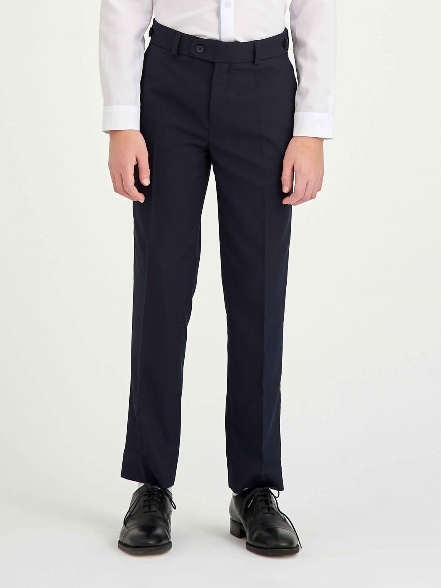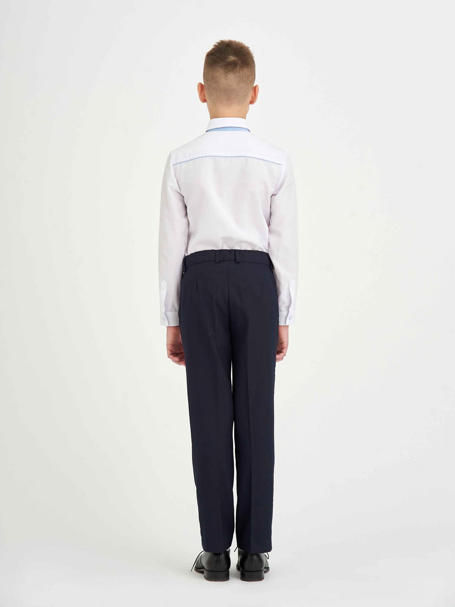 Брюки зауженные из трикотажа джерси для мальчика. Пояс с еврорезинкой сзади. На передней части брюк боковые карманы, горизонтальные защипы и застёжка - гульфик на молнии. На правой задней половинке брюк - карман с узкой листочкой. Отличный вариант на каждый день.