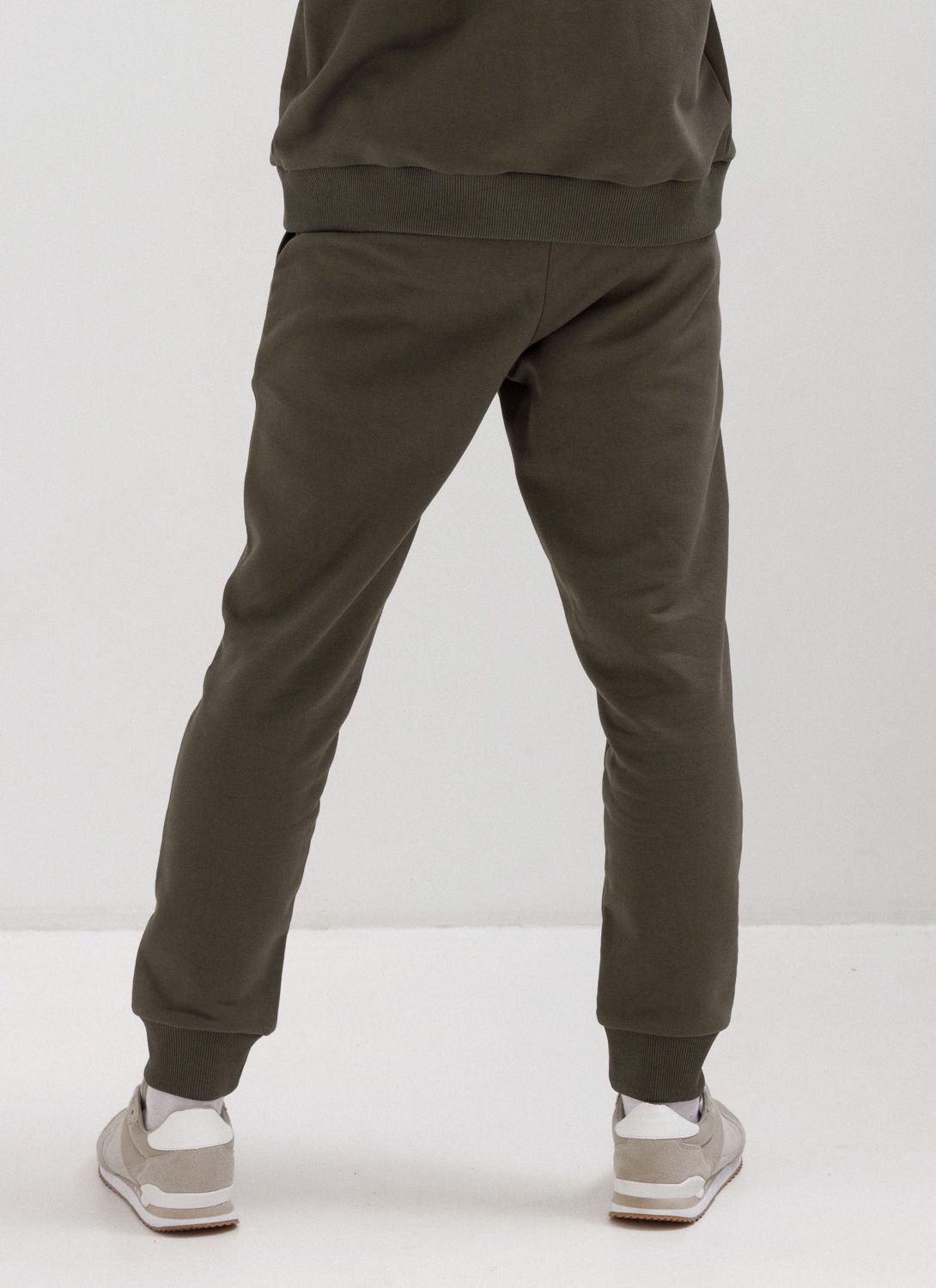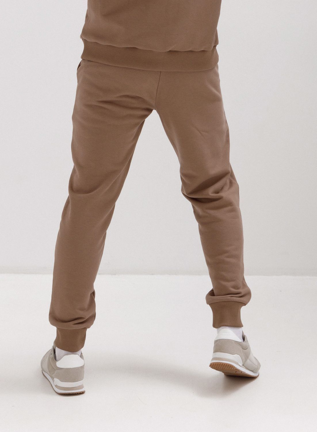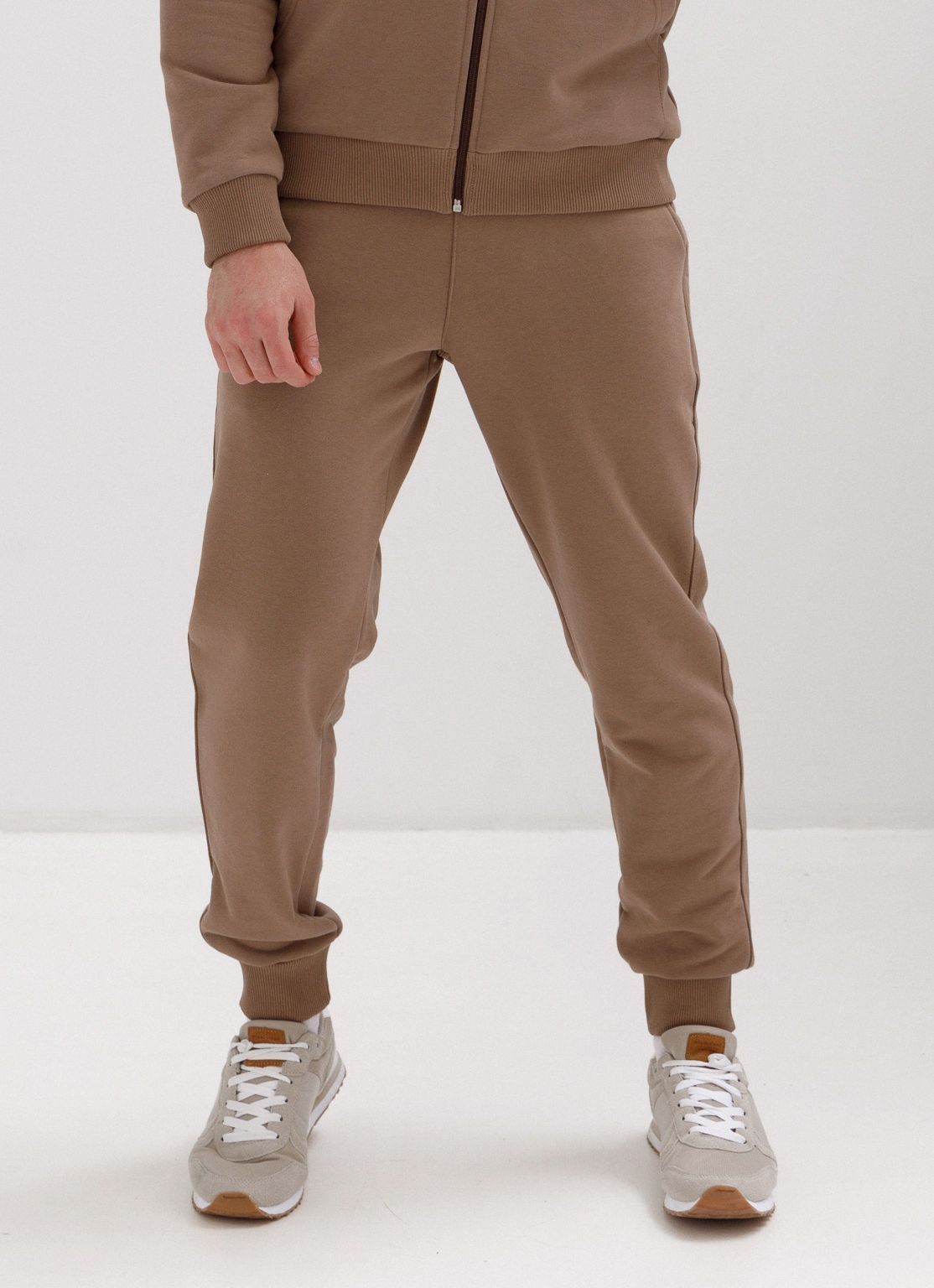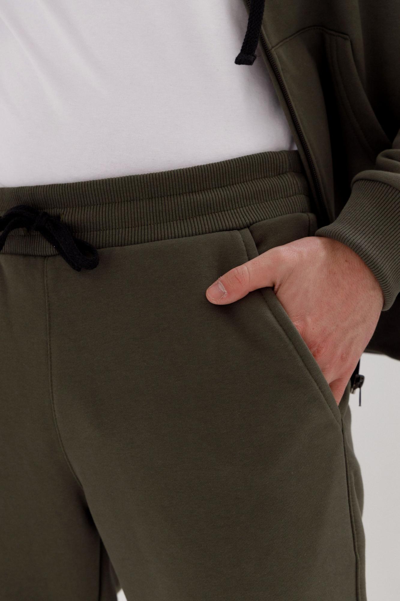 Брюки с манжетами по низу, манжеты из кашкорсе с эластаном. В поясе эластичная тесьма, кулиска отстрочена равномерно двумя параллельными строчками из кашкорсе. В кулиску вставлен шнур с застроченными концами. На передних половинках карманы с отделочной строчкой по входу в карман.