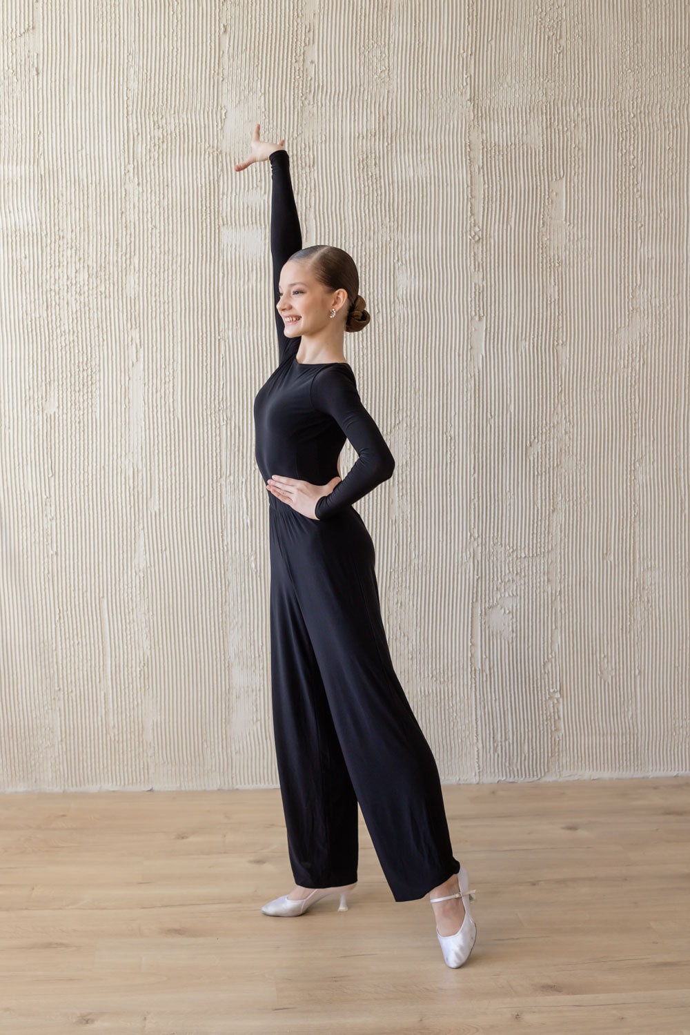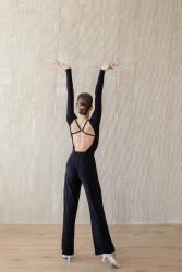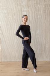 Брюки для спортивных бальных танцев. Крой - "трубы" с одинаковой шириной штанины по всей длине. Высокая посадка. На талии фиксируются широкой резинкой (4 см). Базовая модель для стандарта, можно использовать и для латины. Материал - масло.