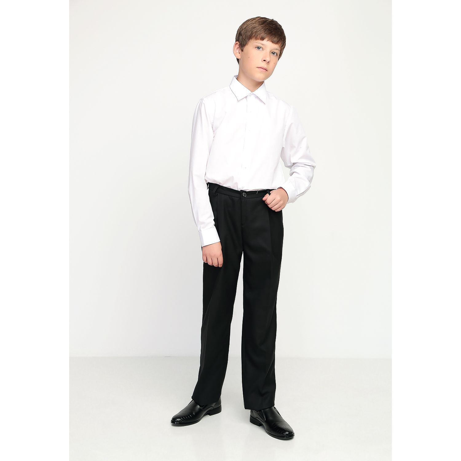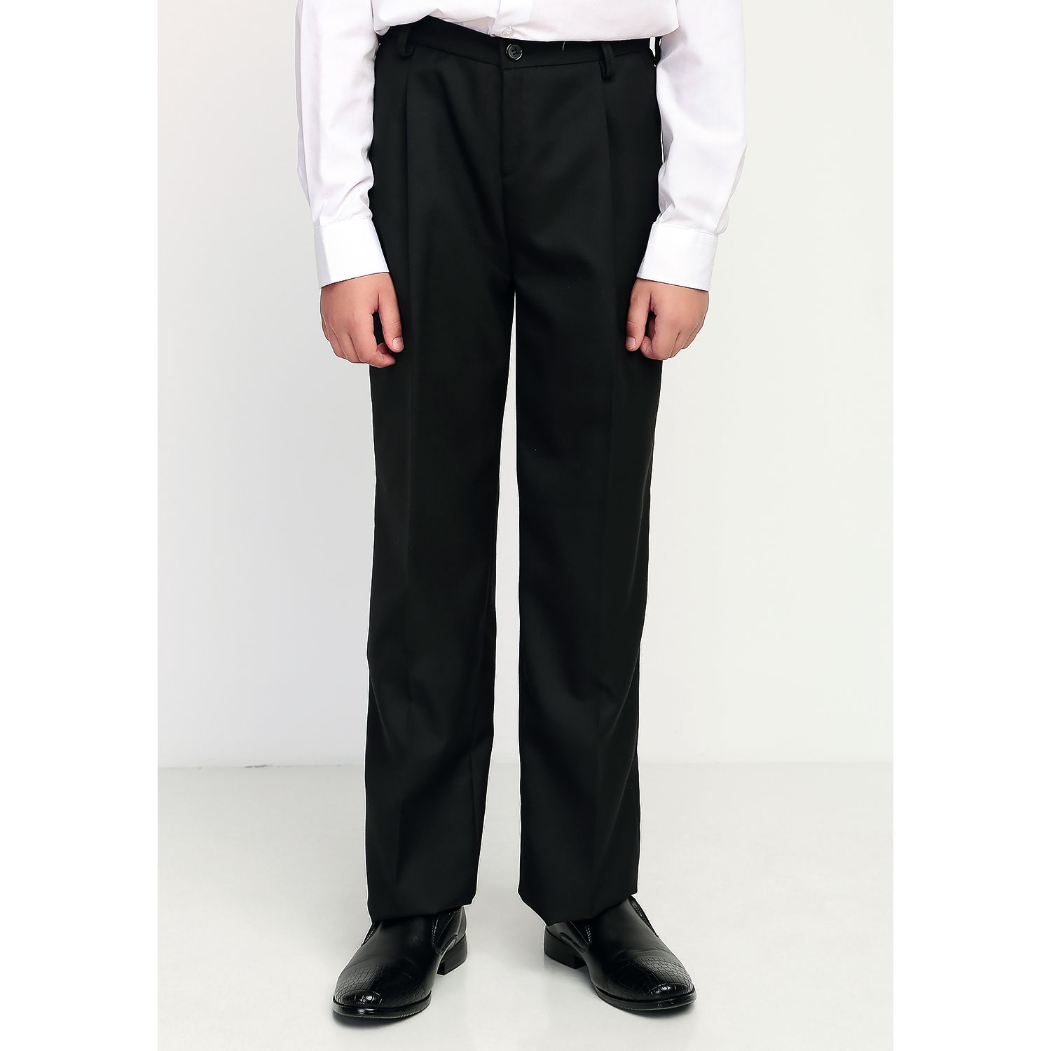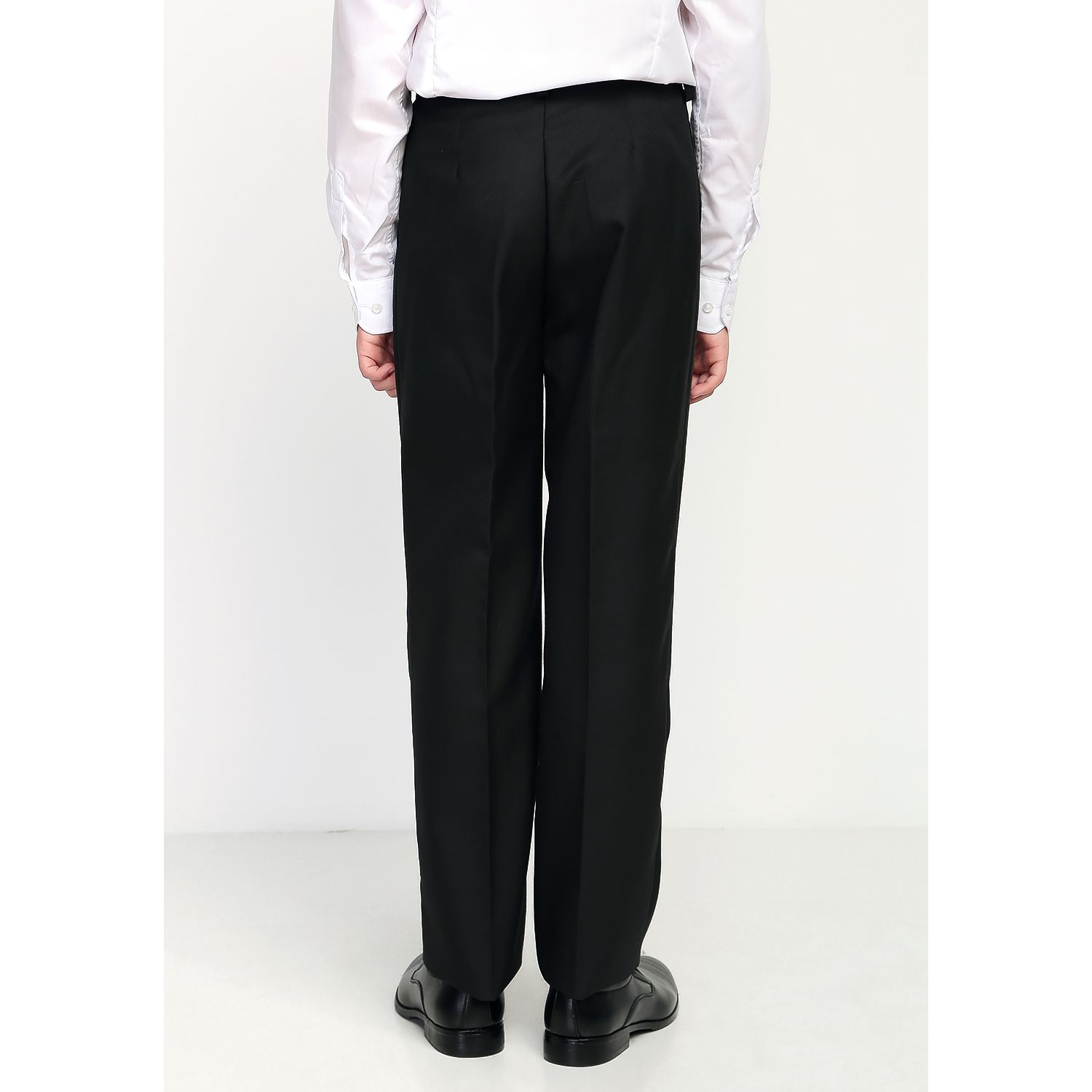 Брюки для мальчика классические черные, на притачном поясе со шлевками, с карманами. Передняя половина брюк на подкладке, застежка на тесьму-молнию. Производство — Россия, Москва. Есть в вариантах из полушерсти или 100% полиэстера.