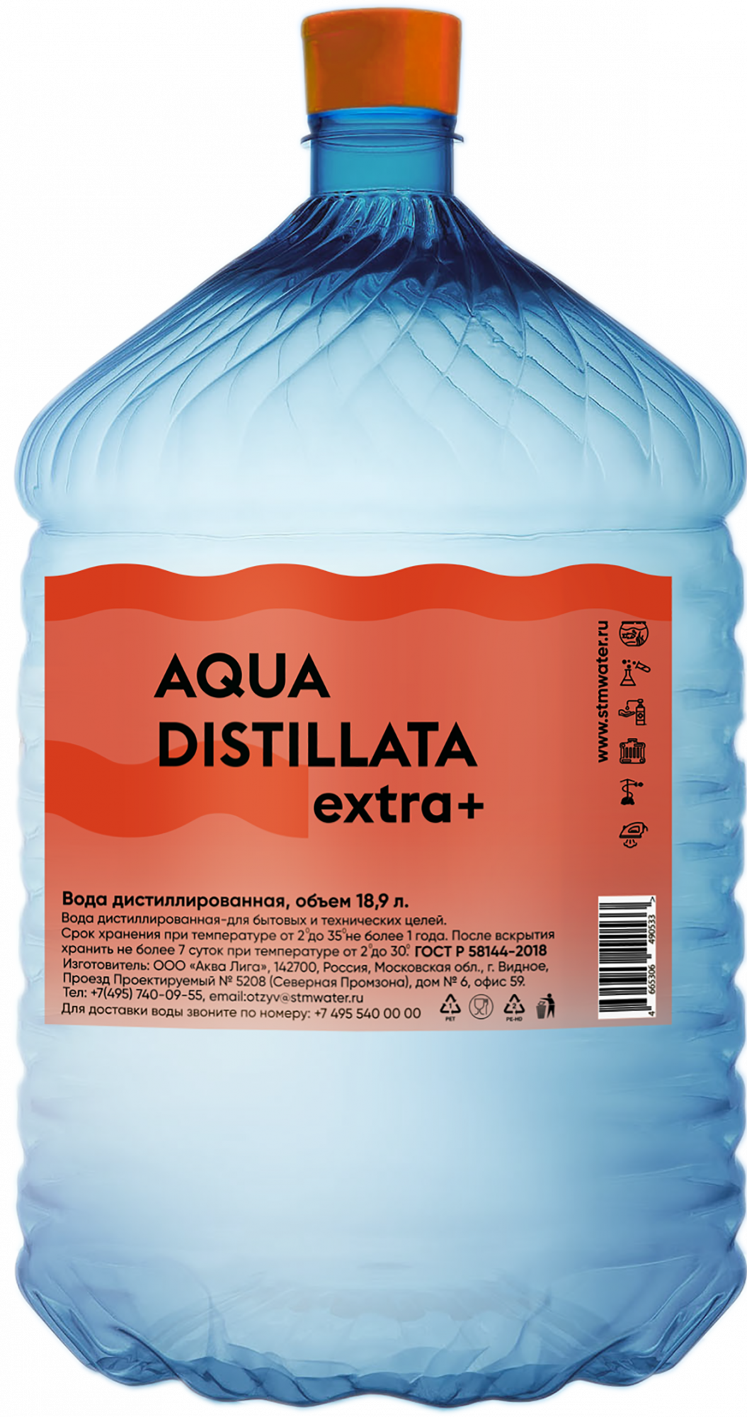Дистиллированная вода «Aqua Distillata Extra+» разлита в ПЭТ-ёмкость 5 литров, с многоразовой крышкой (контроль первого вскрытия) и жесткой пластиковой ручкой, обеспечивающей удобство при транспортировке. Дата производства отштампована на бутылке, срок хранения составляет 12 месяцев с даты производства.