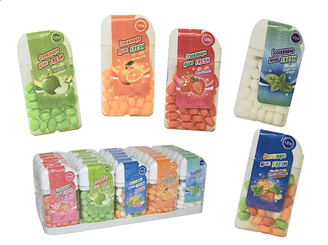 Выберите свой любимый вкус: фруктовый микс, клубника, лимон апельсин и мята. В упаковке сразу 30 футляров с драже по 22грамм в каждом, чего хватит для большой компании детей и взрослых. Раздайте конфеты на детском празднике или приберегите для домашних чаепитий — решать вам.