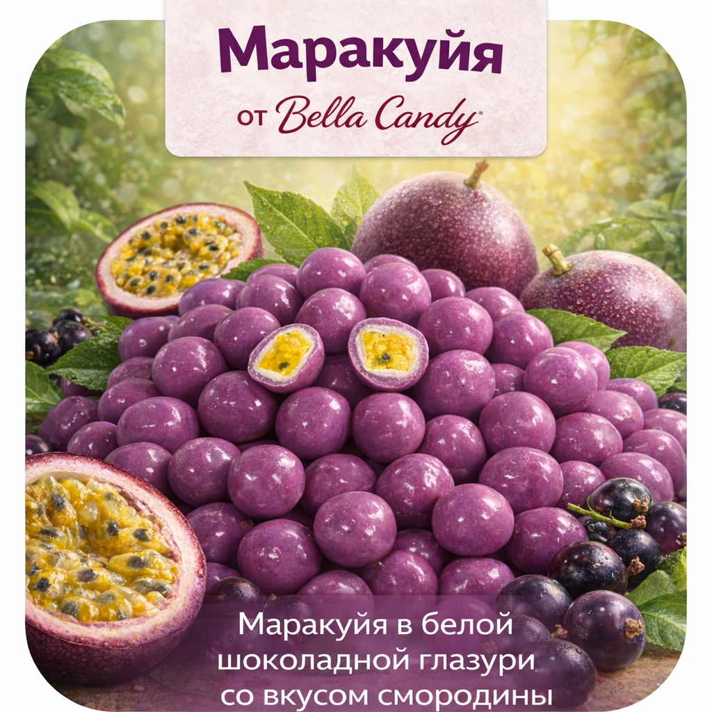 Сублимированная маракуйя в белой шоколадной глазури со вкусом смородины — изысканное сочетание тропической кислинки и нежной сладости.