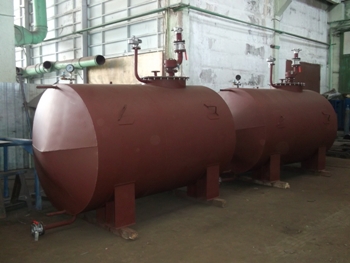 Двустенные резервуары для нефтепродуктов производства УЗНО могут иметь одно-, двух- или трехкамерную конструкцию (двустенные перегородки), размещаться в грунте (подземные резервуары), на открытом воздухе или в помещении (наземные резервуары). Применяются, как правило, на АЗС в качестве резервуаров хранения и выдачи жидкого моторного топлива, для чего укомплектовываются всем необходимым дополнительным оборудованием (краны, клапана, огнепреградители и т.п.). Вид резервуара выбирается применительно к конкретному предназначению. При надземном размещении резервуар оборудуется площадкой обслуживания с лестницей для доступа к горловине, может быть покрыт антикоррозийным лакокрасочным материалом. При подземном – комплектуется технологическим колодцем с искробезопасной крышкой для доступа к горловине, при необходимости гидроизоляция может быть нанесена в заводских условиях. Определяющие характеристики по пожеланию заказчика: объем, расчетное давление (толщина стенки), вид покрытия, комплектация оборудованием.