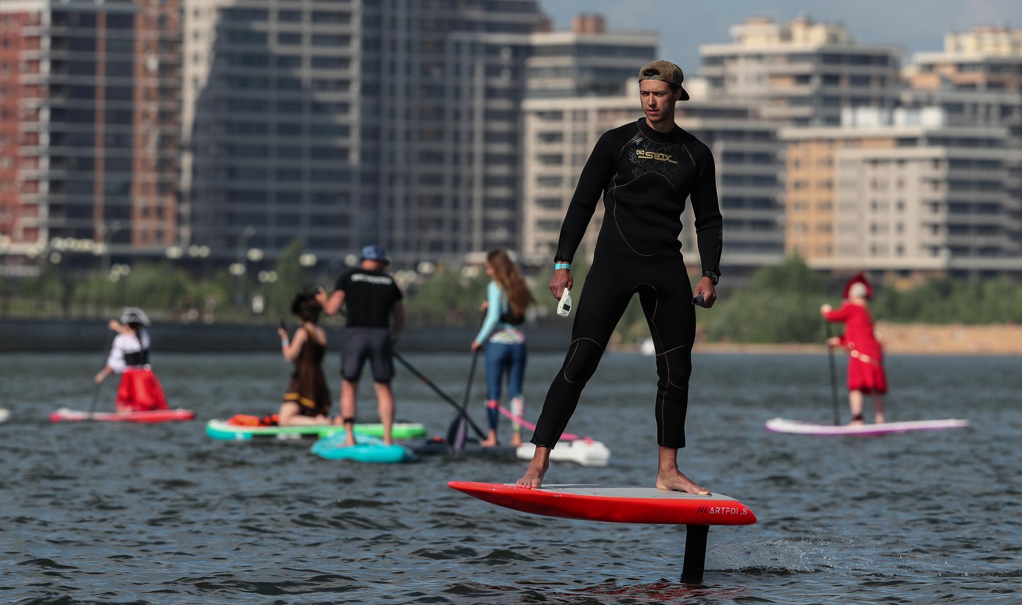 доска для сервинга с подводным крылом и электро мотором чтобы летать над водой.