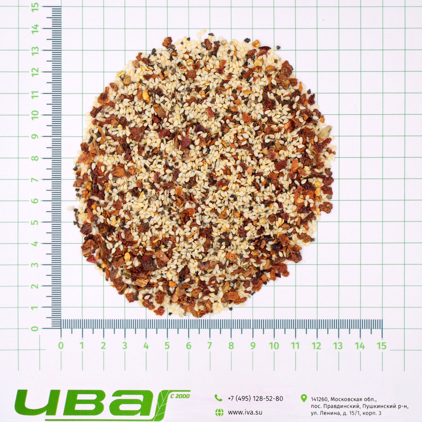 Состав: кунжутное семя белое, паприка красная хлопья, перец черный дробленый.