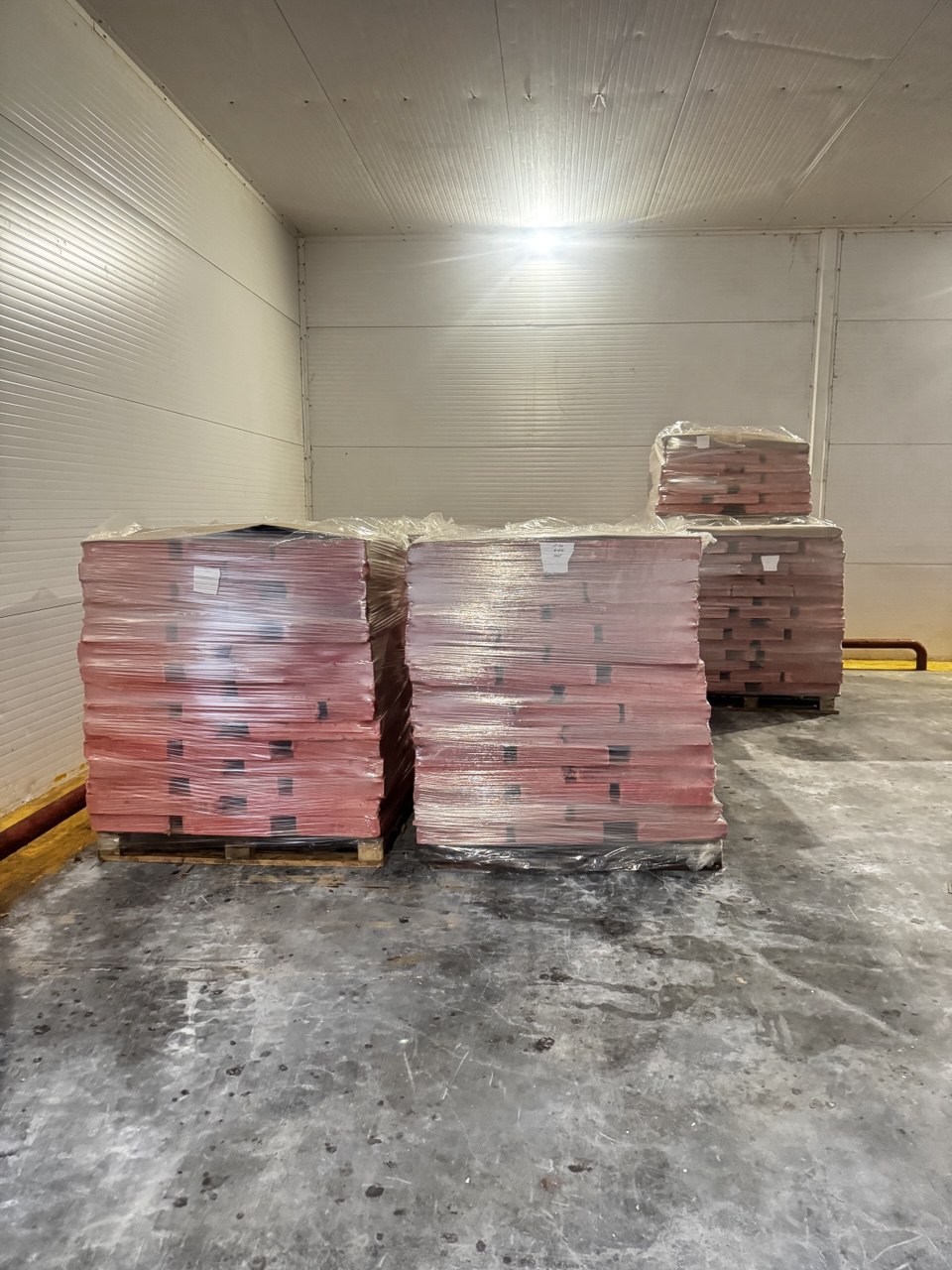 Фарш куриный замороженный поставляется в блоках, уложенных на паллет, между паллетом и нижним рядом блоков сырья должна быть картонная подложка, для исключения контакта сырья с поддоном.