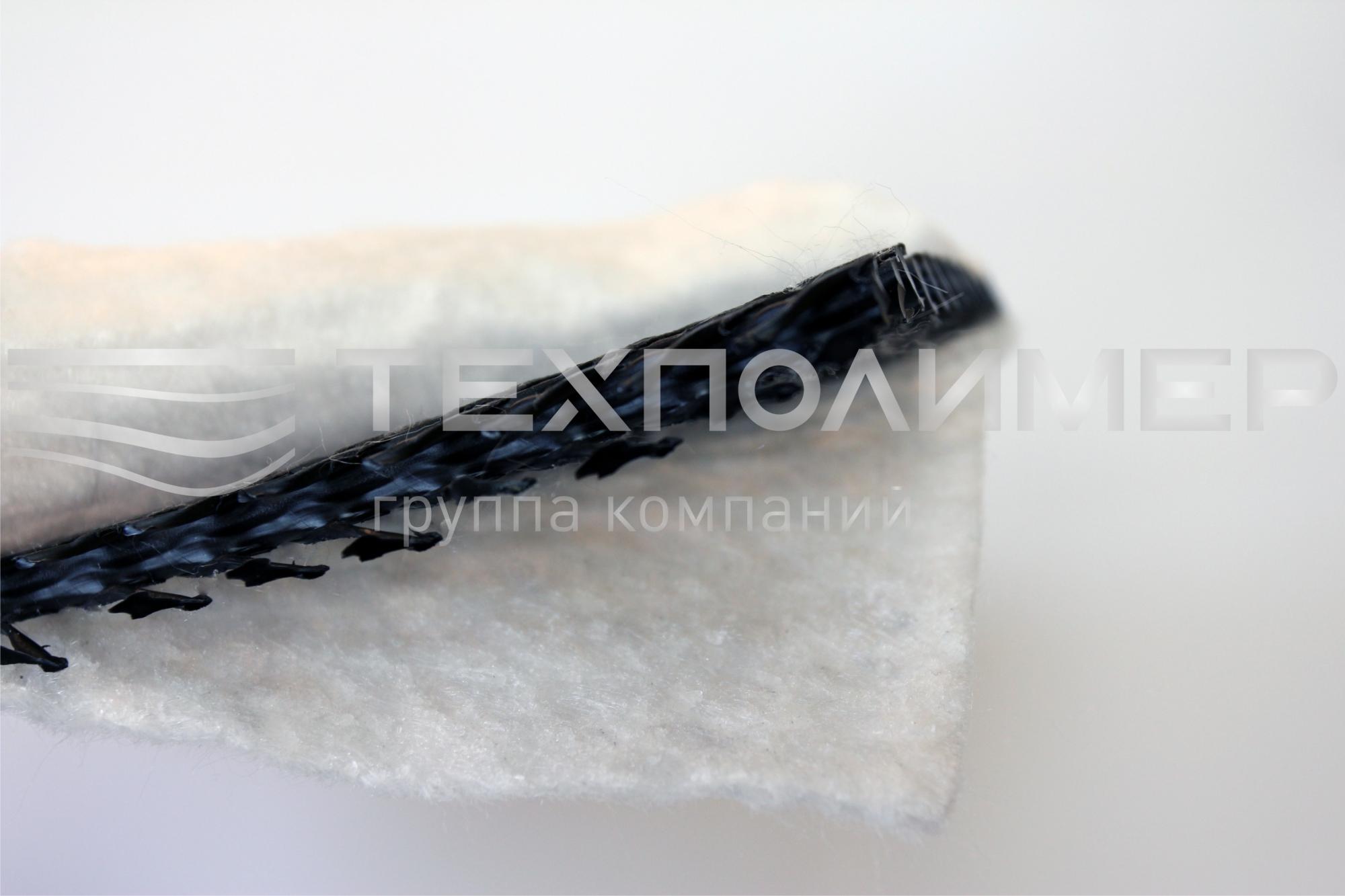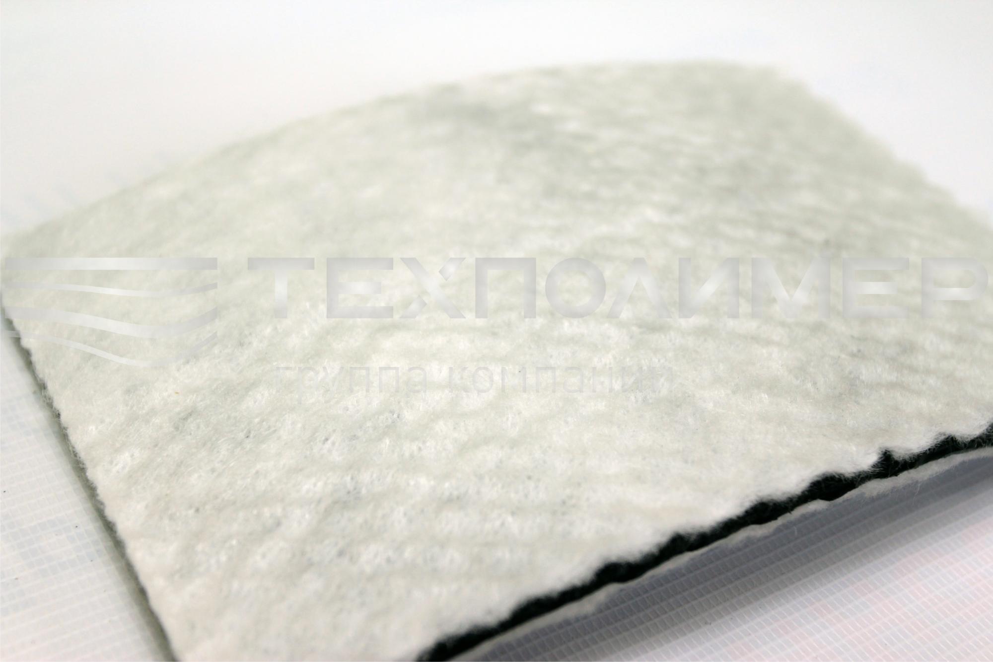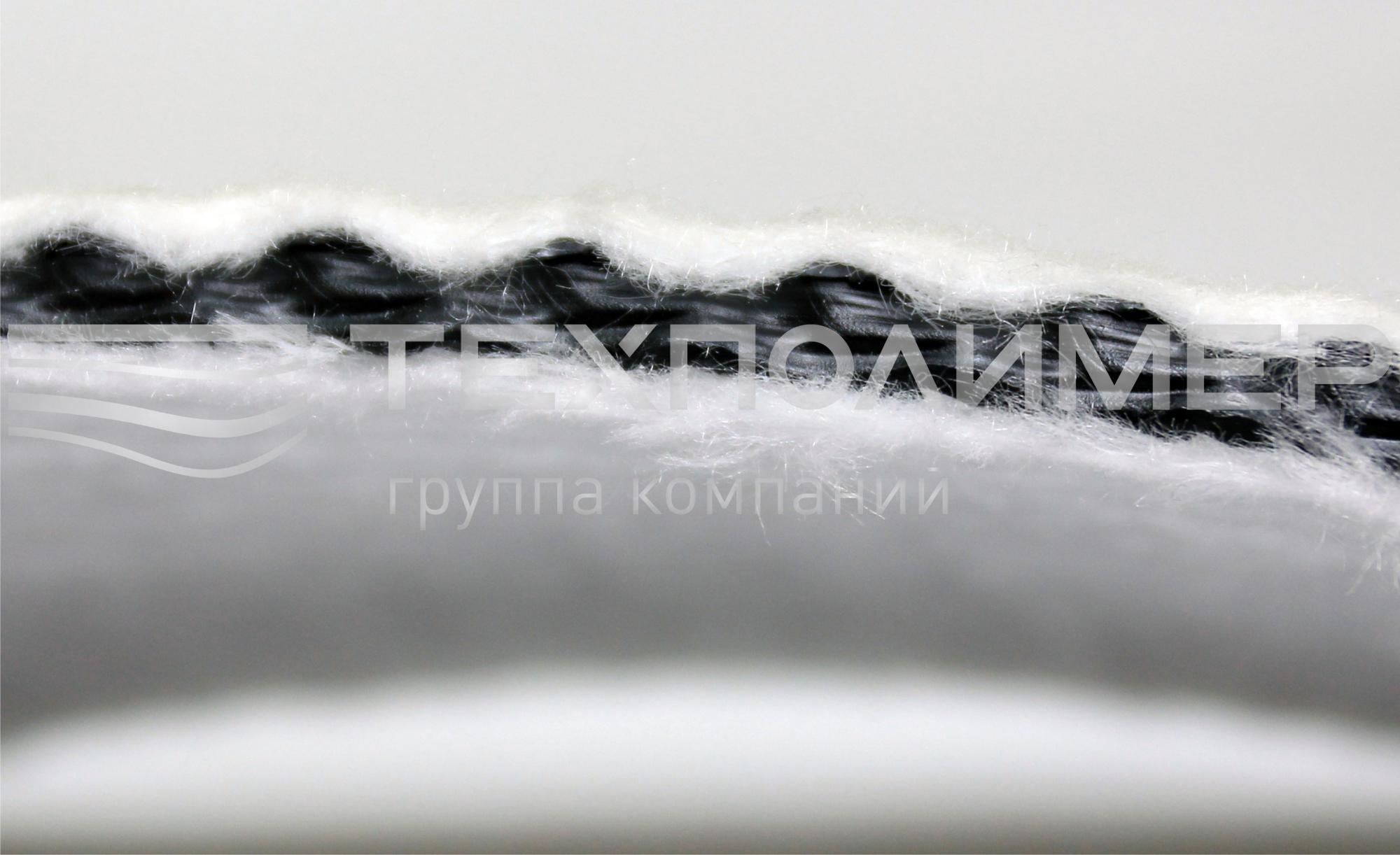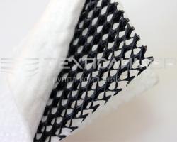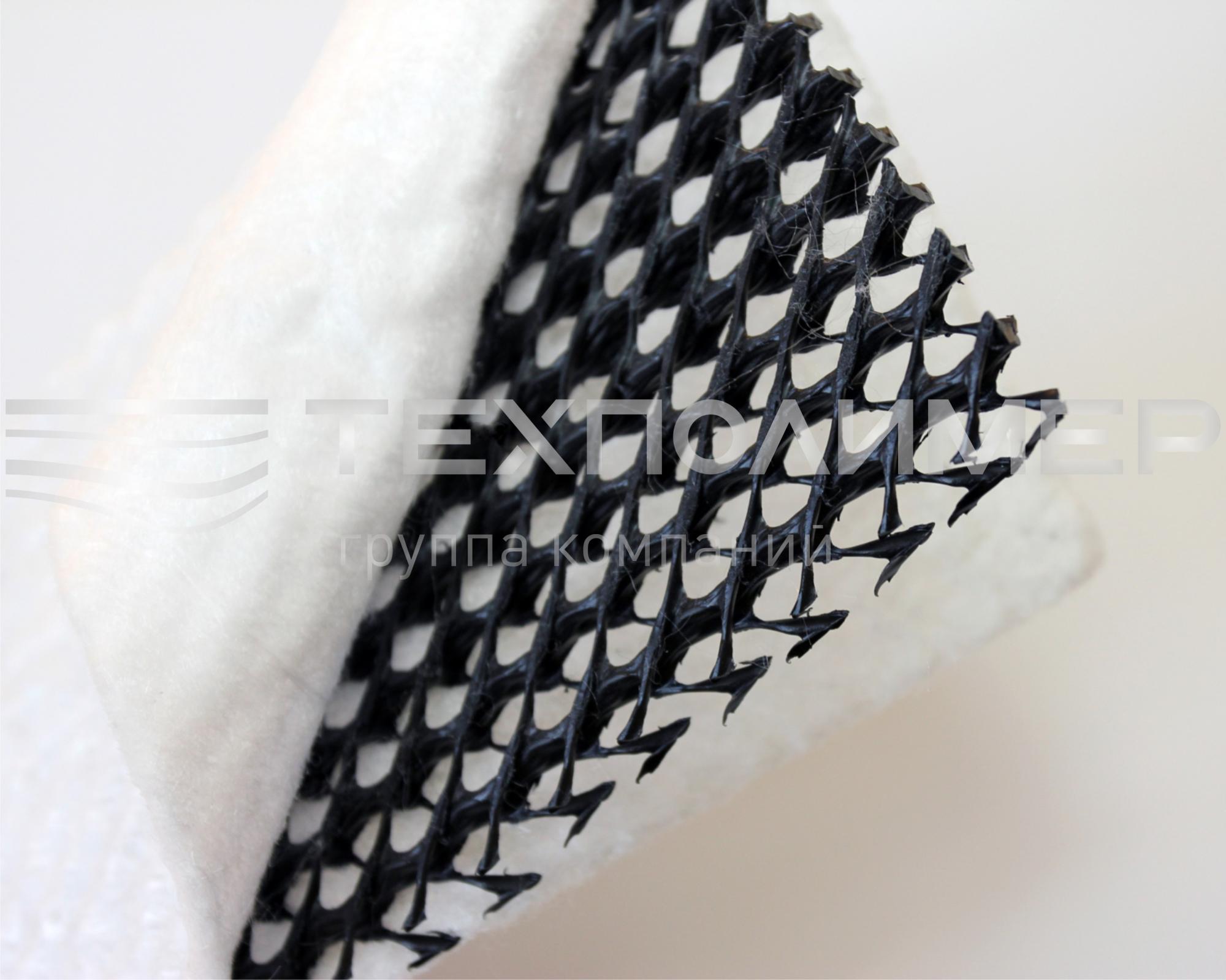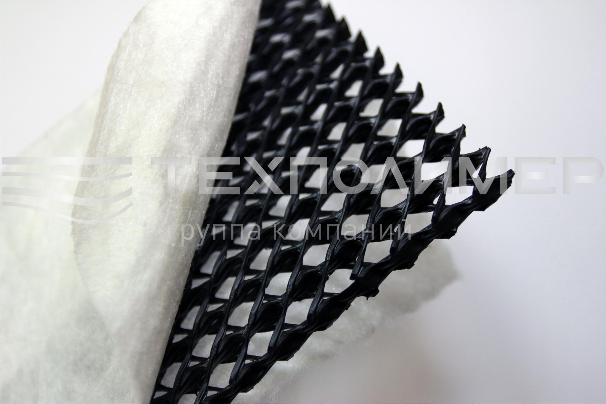 Геокомпозитный дренажный материал в виде объемной ромбовидной сетки, скрепленной с нетканым геотекстилем с обеих сторон.