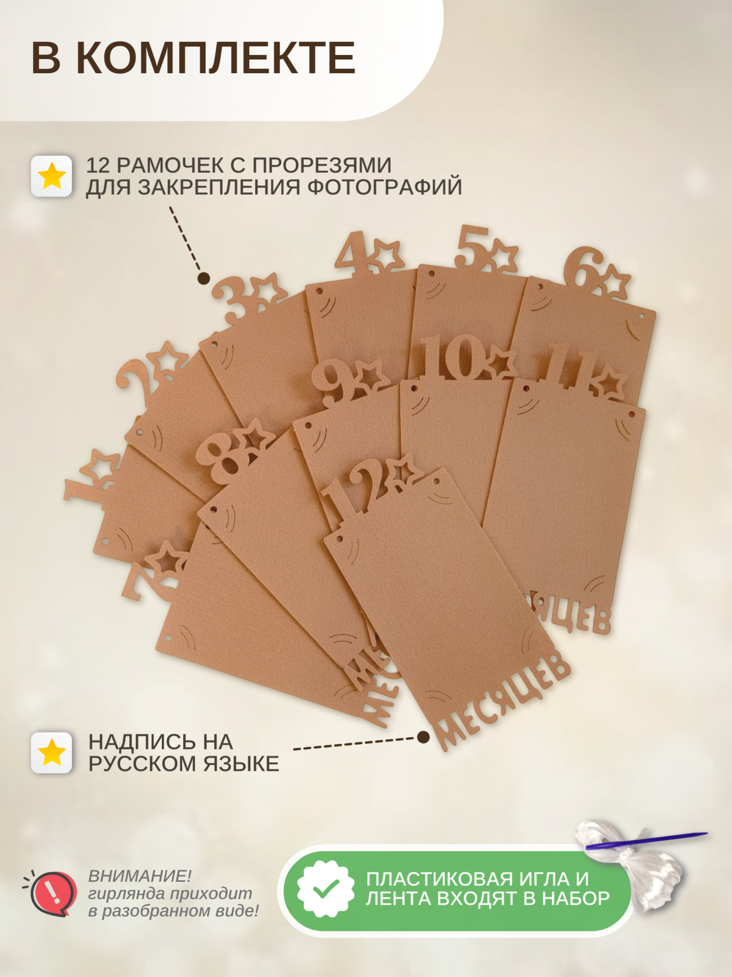Цвет: коричневый.Комплектация: 12 рамочек для фото с прорезями и с цифрами и надписью на русском языке, лента для подвешивания, игла пластиковая с большим ушком для удобной сборки гирлянды.