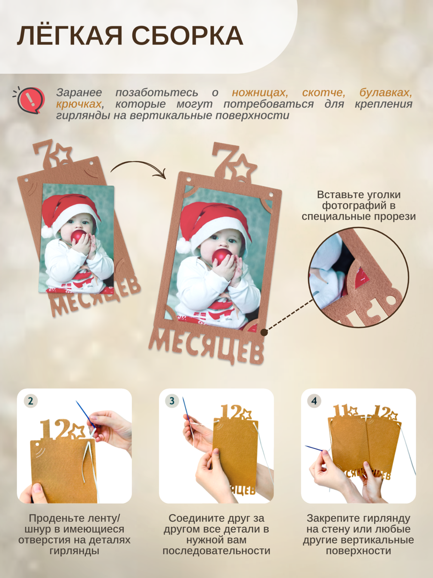 5. Лёгкость в креплении – гирлянда легко собирается на ленту или шнурок, вешается на стену или шторы с помощью булавок, скотча, прищепок и т.д.