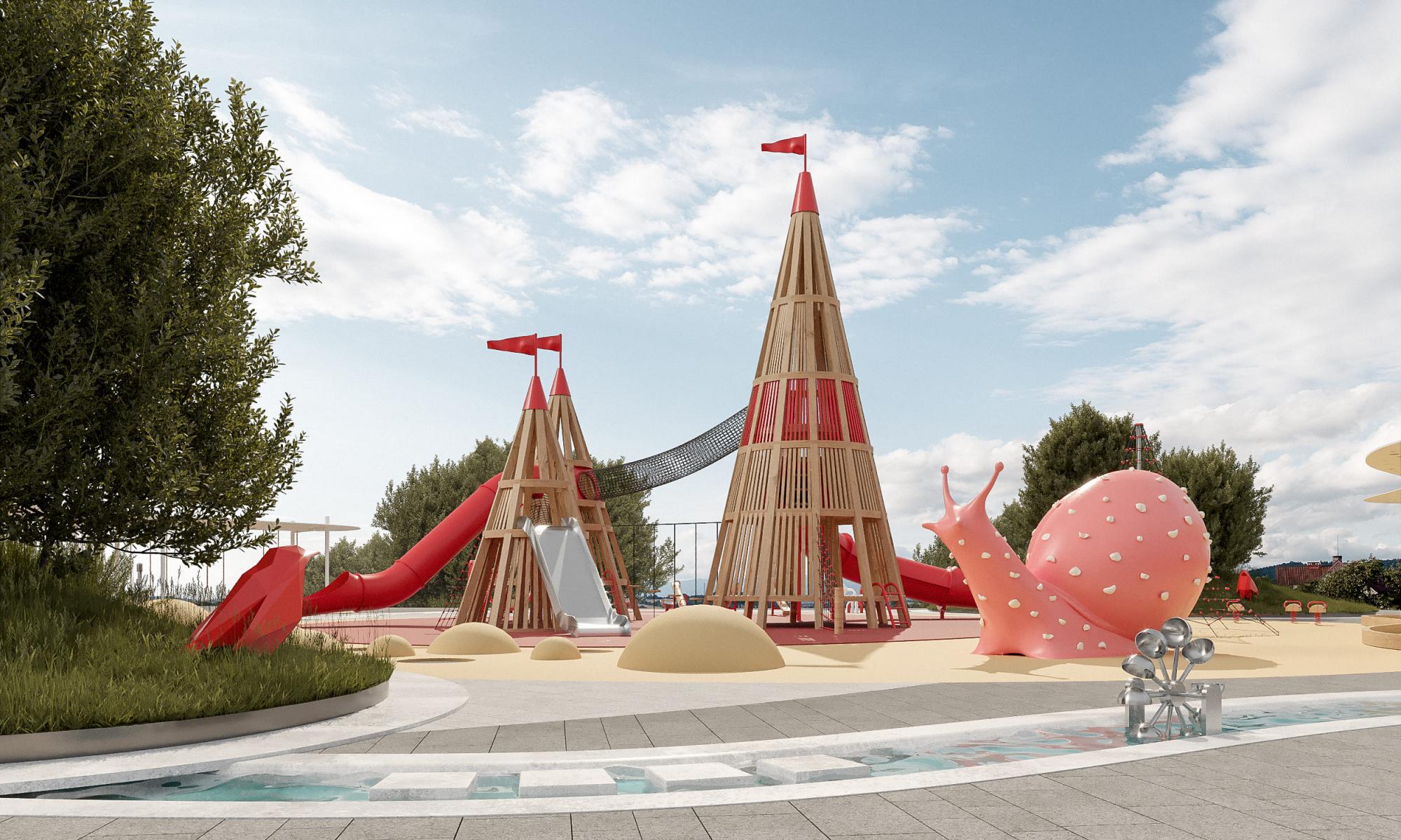 В функциональном наполнении площадки "Навахо" главный акцент создают башенный комплекс с горками, скатами и туннелями, а также элементы водных игр и зона для игры с песком. Из дополнительных элементов, мы оснастили площадку скалодромами в виде милой улитки и башни из армированного каната, чашами-вертушками, качелями-балансирами и пружинками, вращающимися круглыми скамейками и навесами от солнца, где комфортно будет наблюдать за детьми их родителям.
