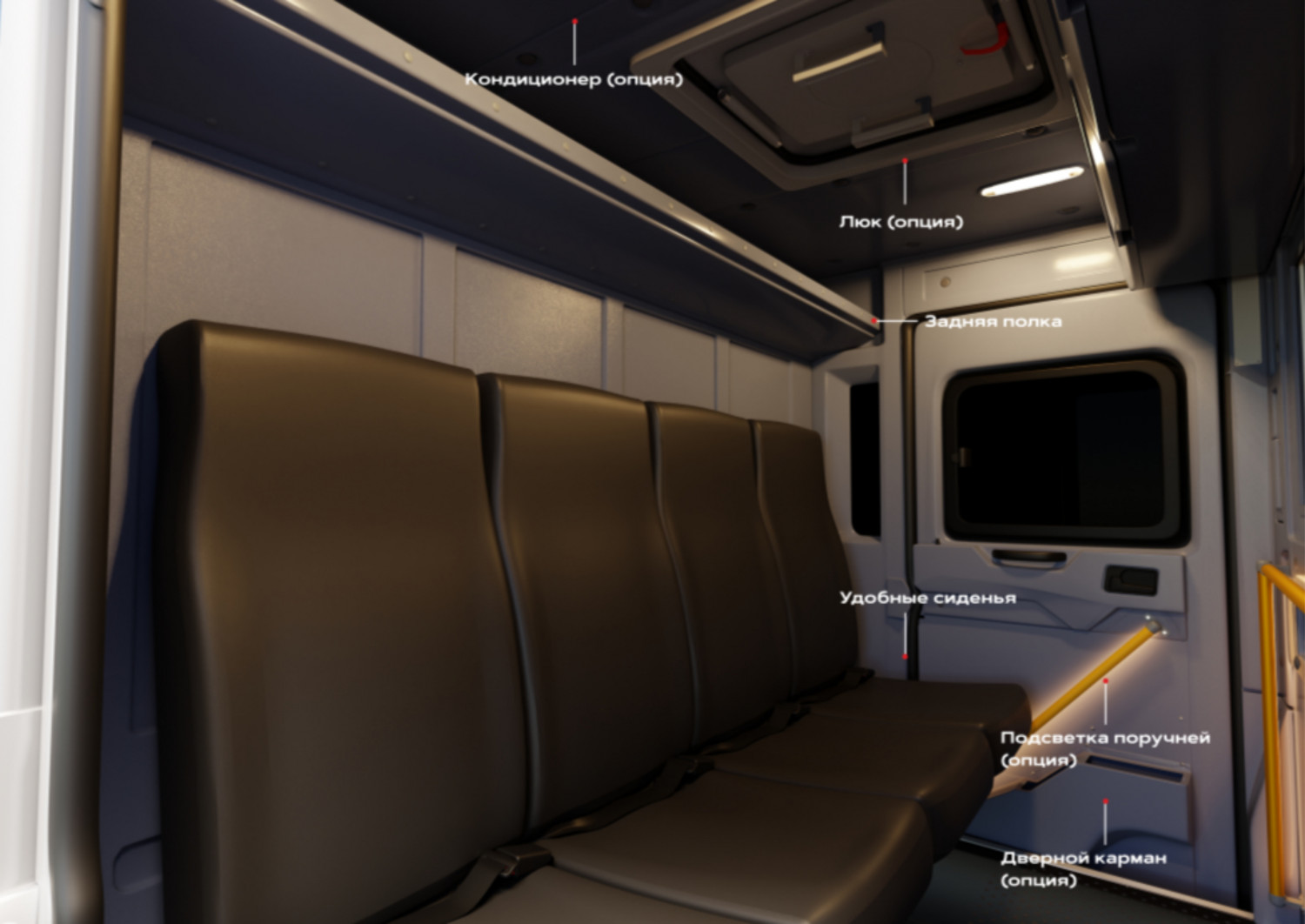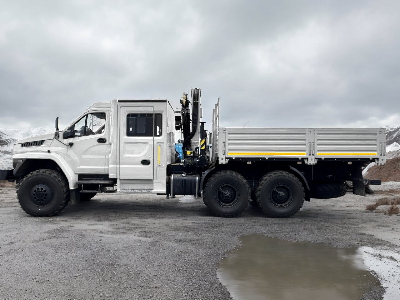 Грузопассажирский автомобиль на базе Урал Next 4320-6952-74 оборудован модульной кабиной из прочного стеклопластика для перевозки ремонтной бригады до 4 человек к месту проведения работ. Кабина легкая, устойчива к механическим повреждениям и эргономичнее стандартных аналогов. В задней части размещена открытая грузовая платформа с откидными бортами (размеры 4333х2550х750 мм, настил — транспортная фанера). Между кузовом и кабиной установлена крано-манипуляторная установка с выдвижными аутригерами, обеспечивающими устойчивость при погрузочно-разгрузочных операциях.