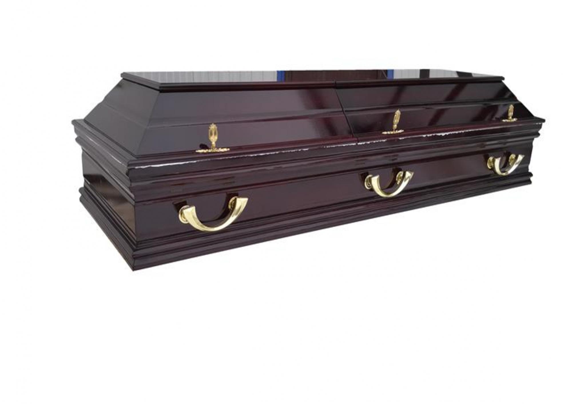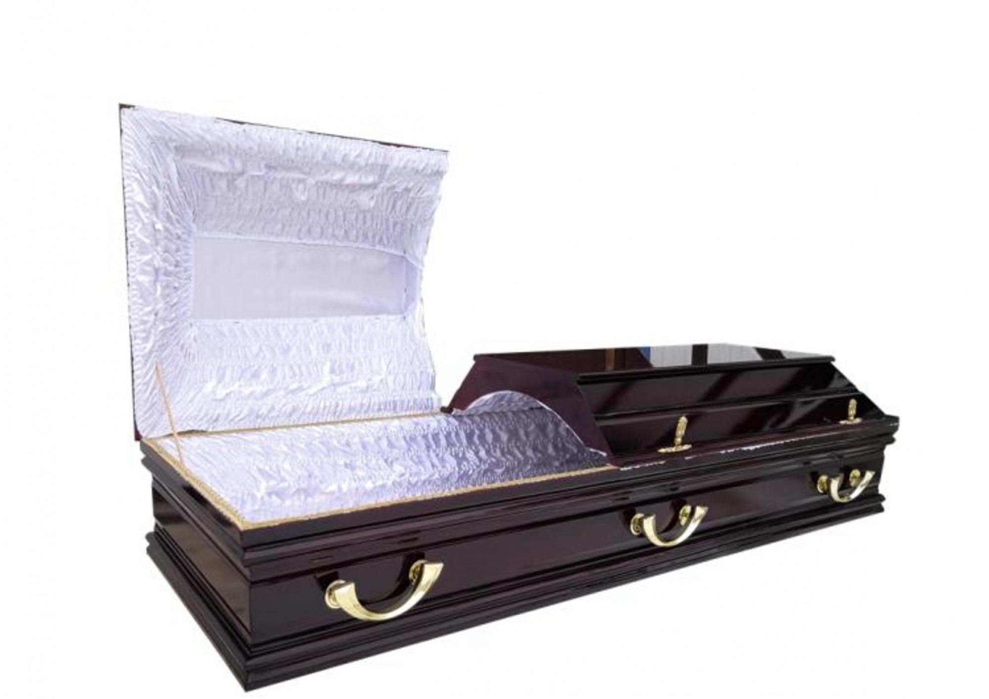 Лакированный гроб. Обивка "Атлас", Ручки "Дуги несущие" Цвета: орех, красное дерево.