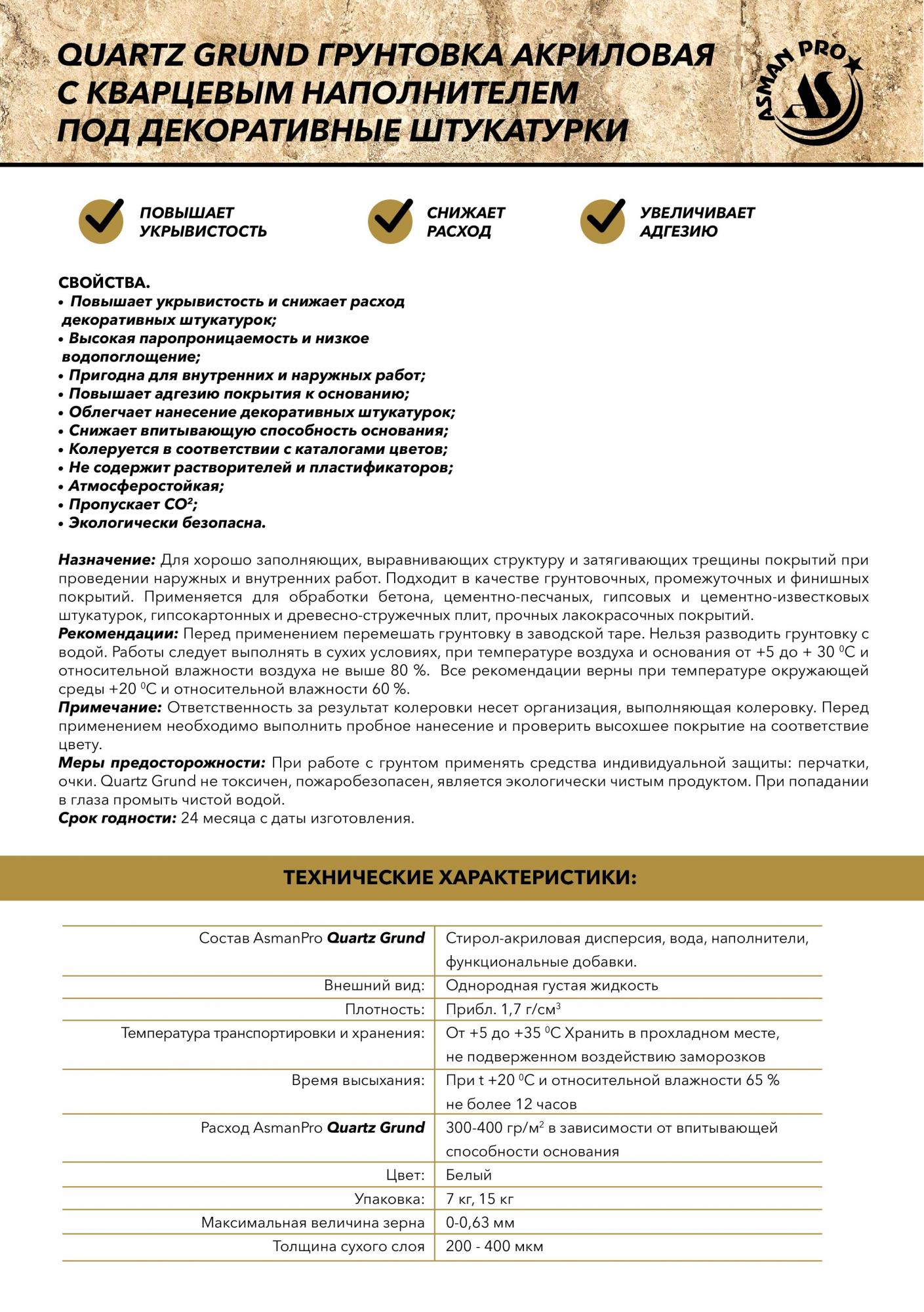 Грунтовка ASMANPRO Quarz Grund акриловая с кварцевым наполнителем под декоративные штукатурки 15 кг