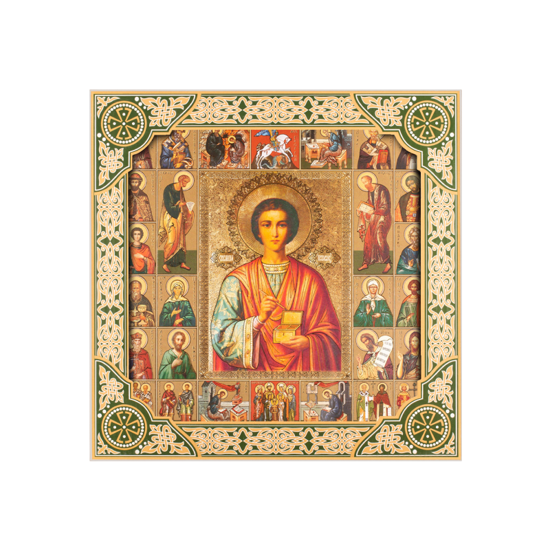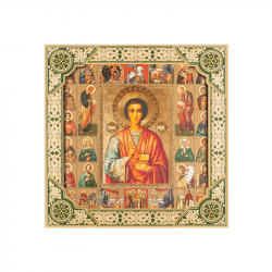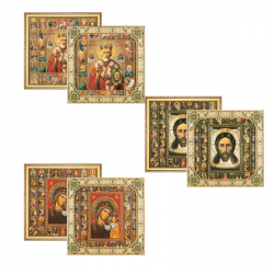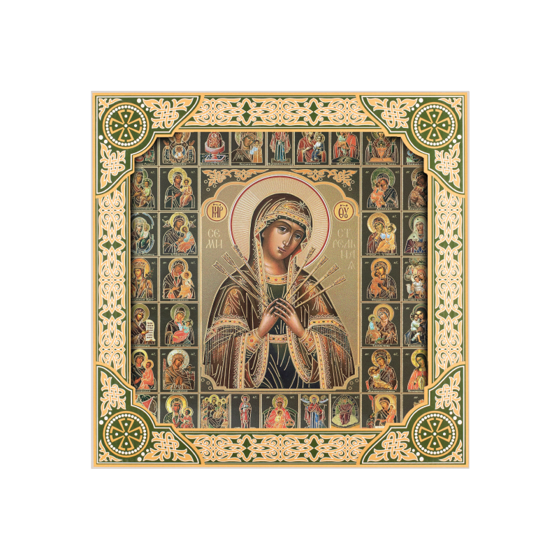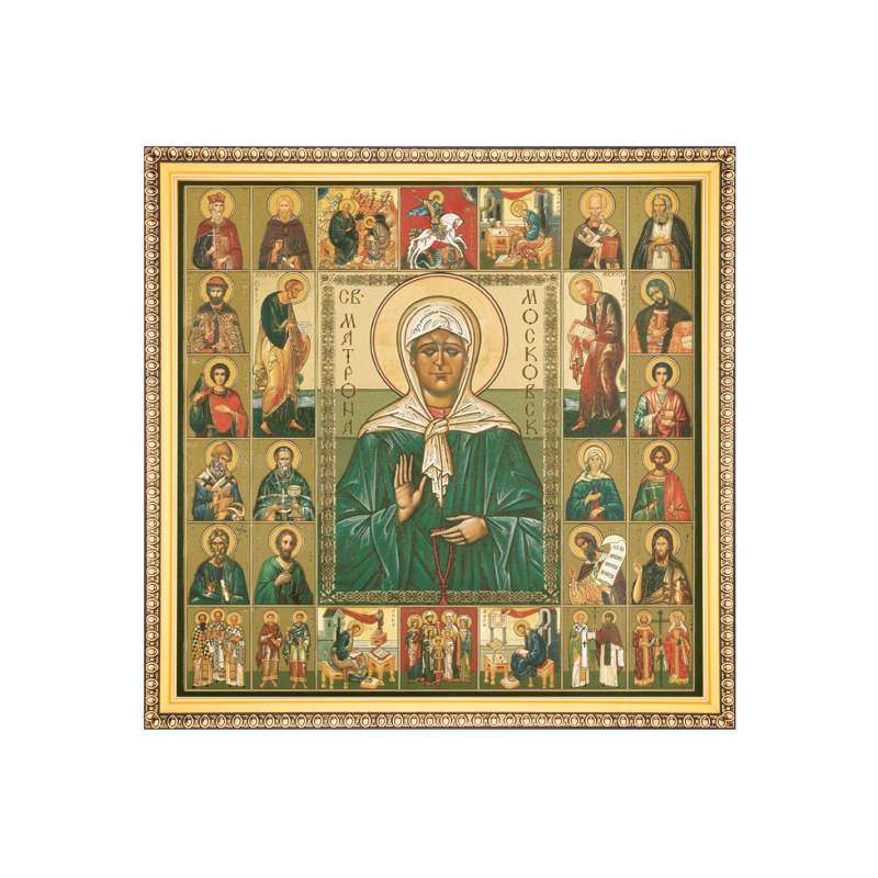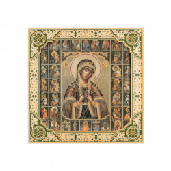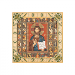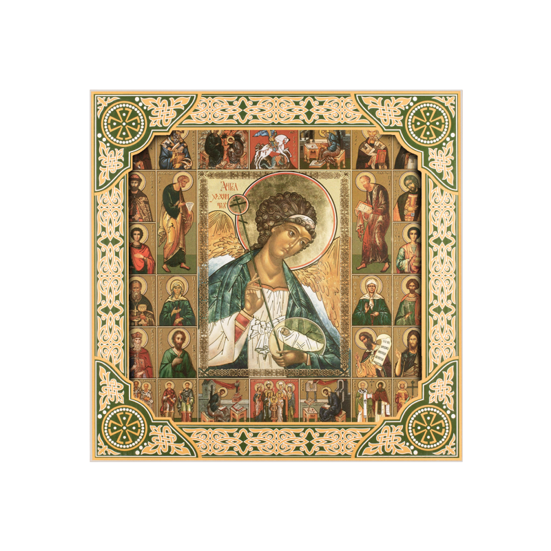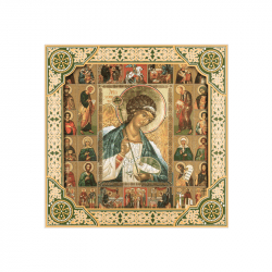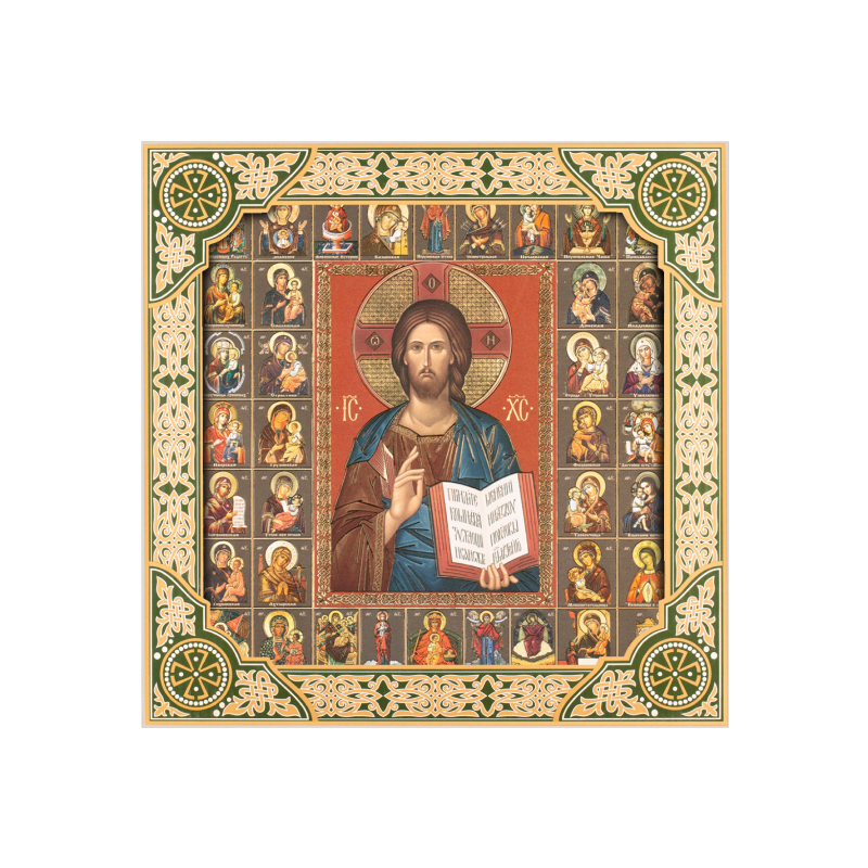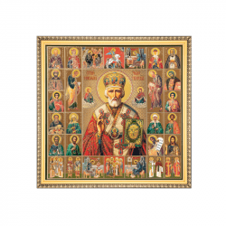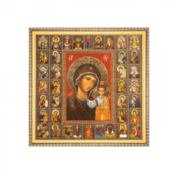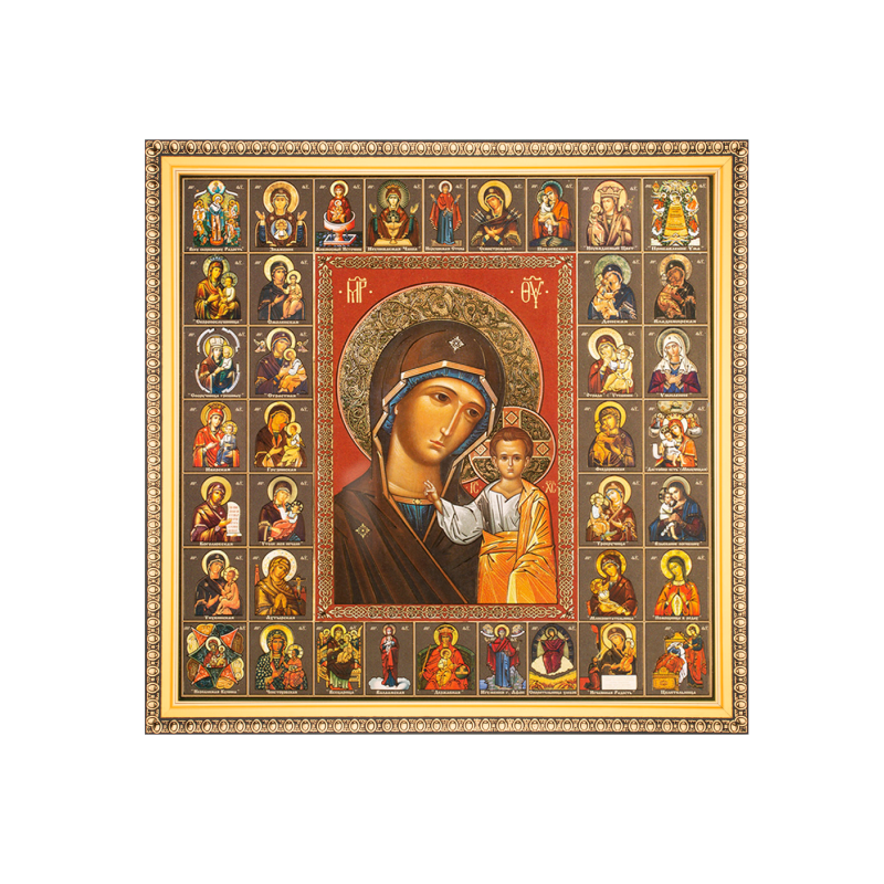 Изображение иконы выполнено с использованием полиграфической печати с золотым тиснением. Тонкий слой ламинации надежно защищает изображение от внешних воздействий. Расположено в рамке со стеклом. Размер печатного изображения иконы 25х25 см.