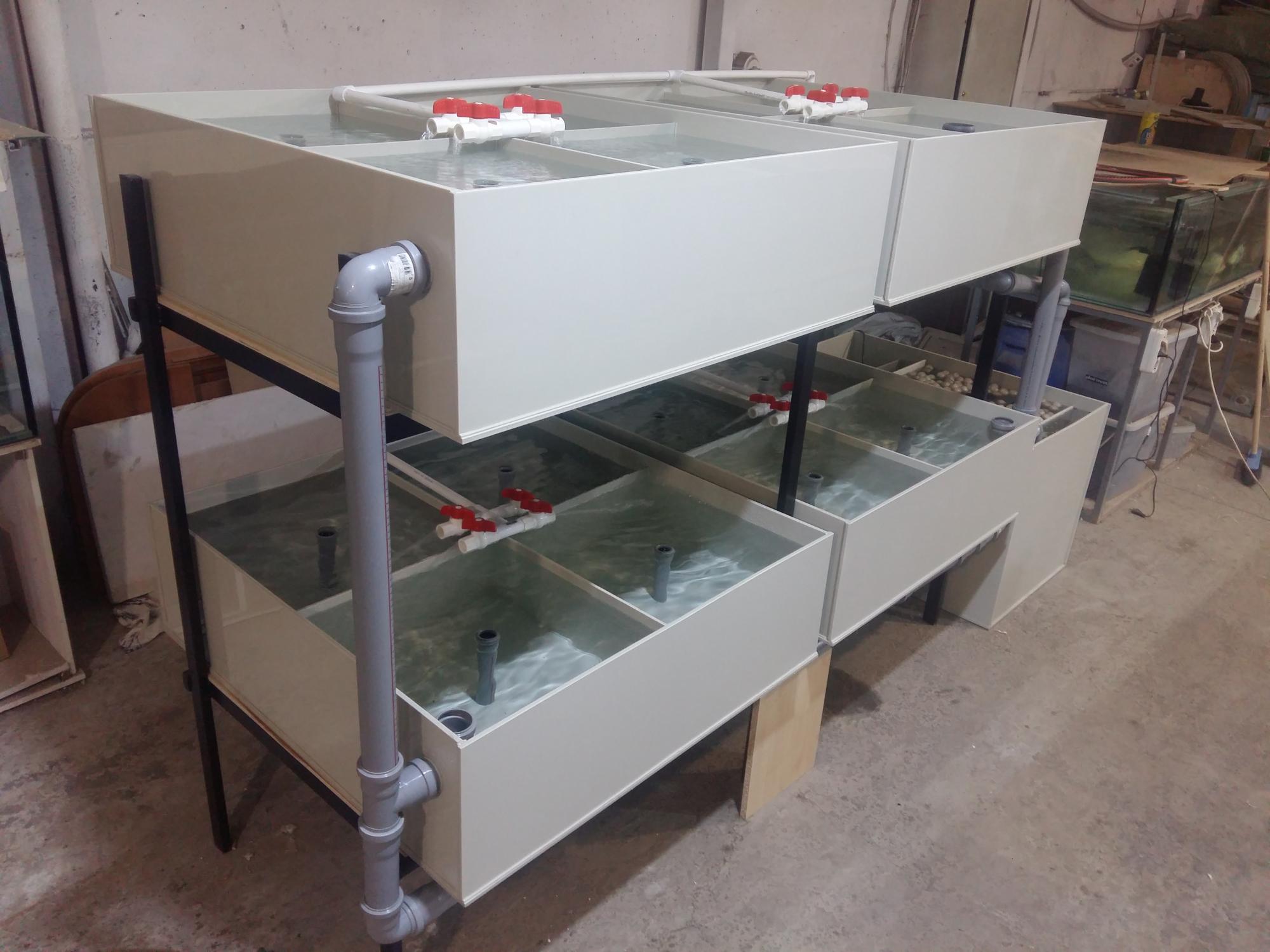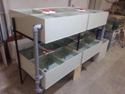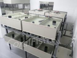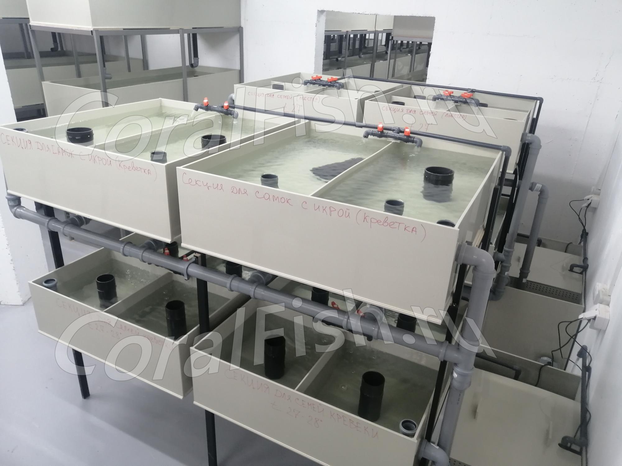 Размеры емкостей: 960х1000х300 4 шт., каждая ёмкость поделена на 4 секции, таким образом, в одном модуле можно разместить 16 семей ракообразных.