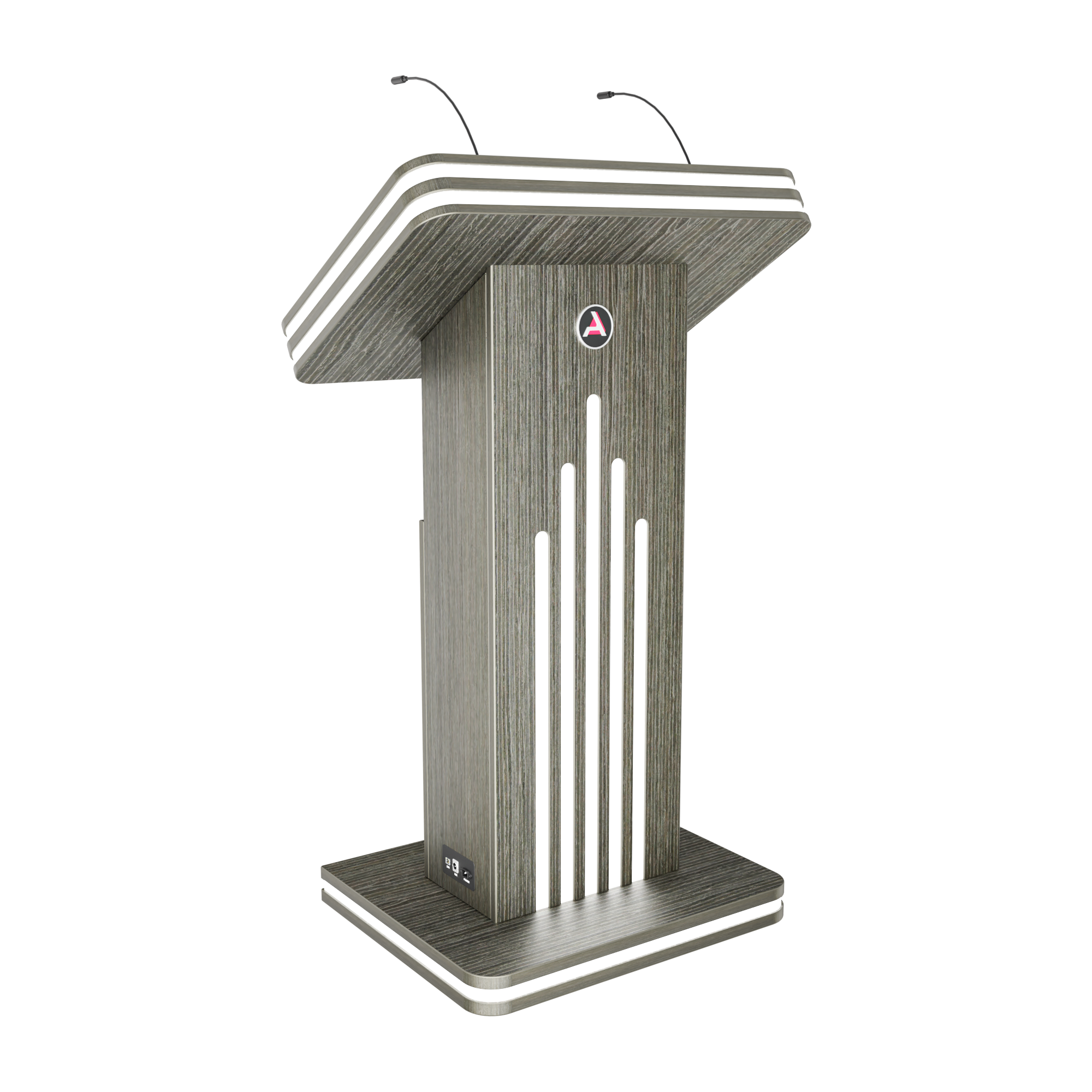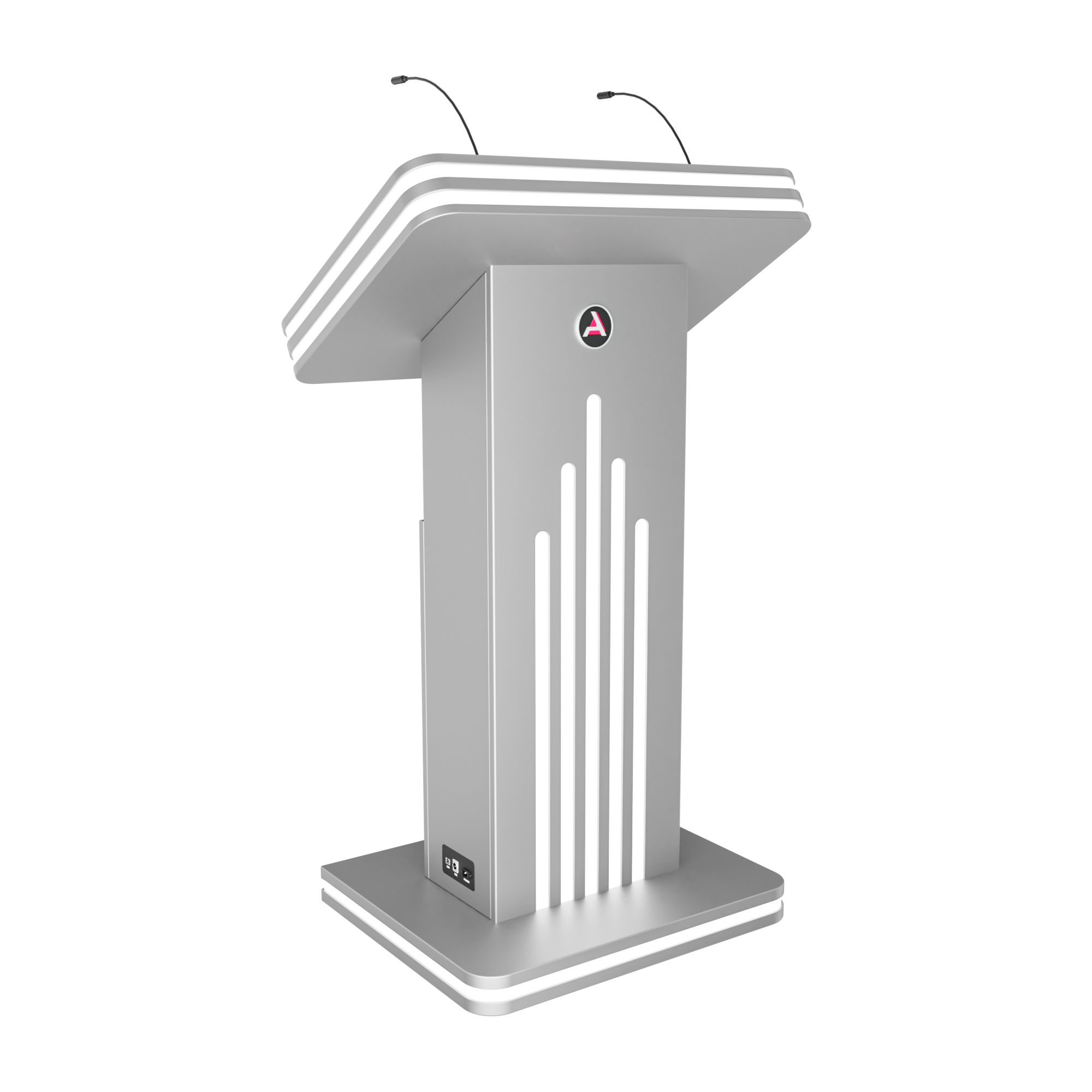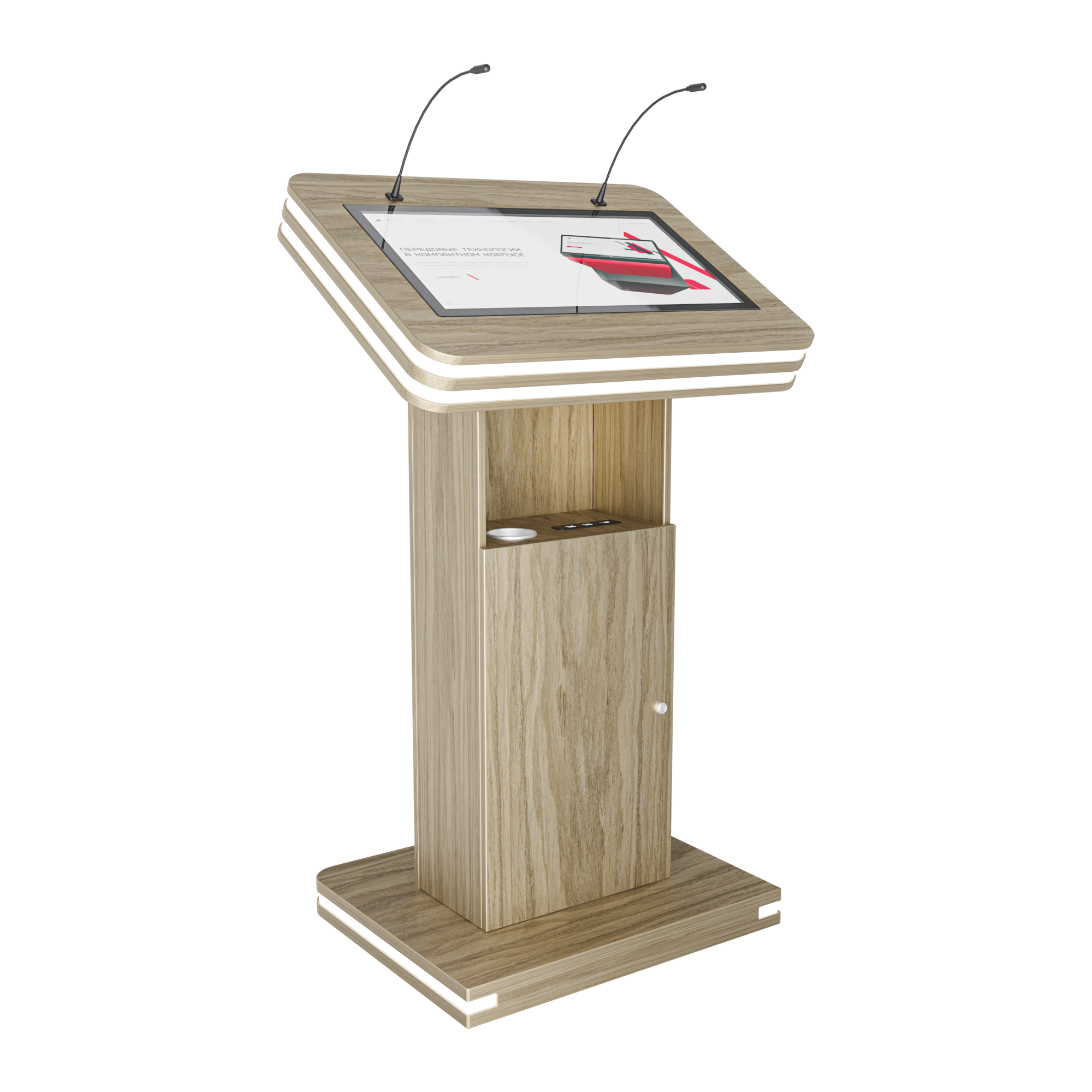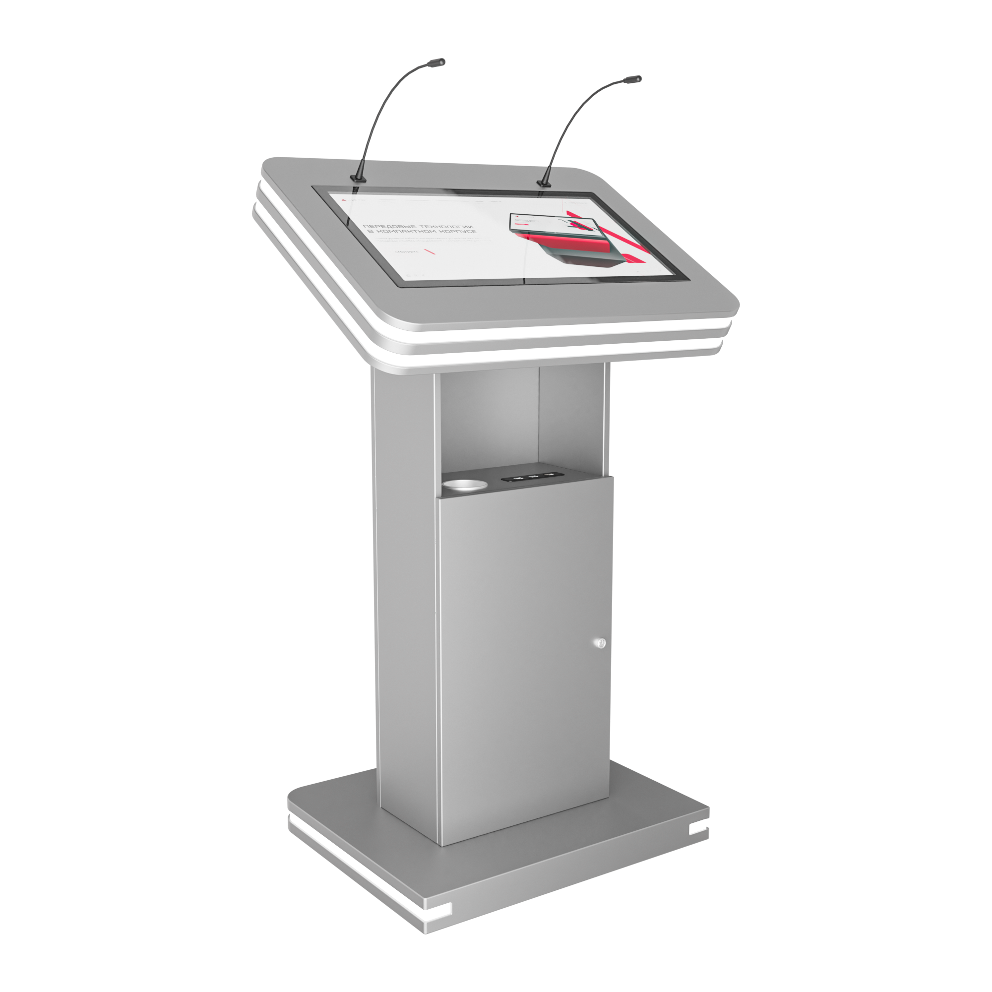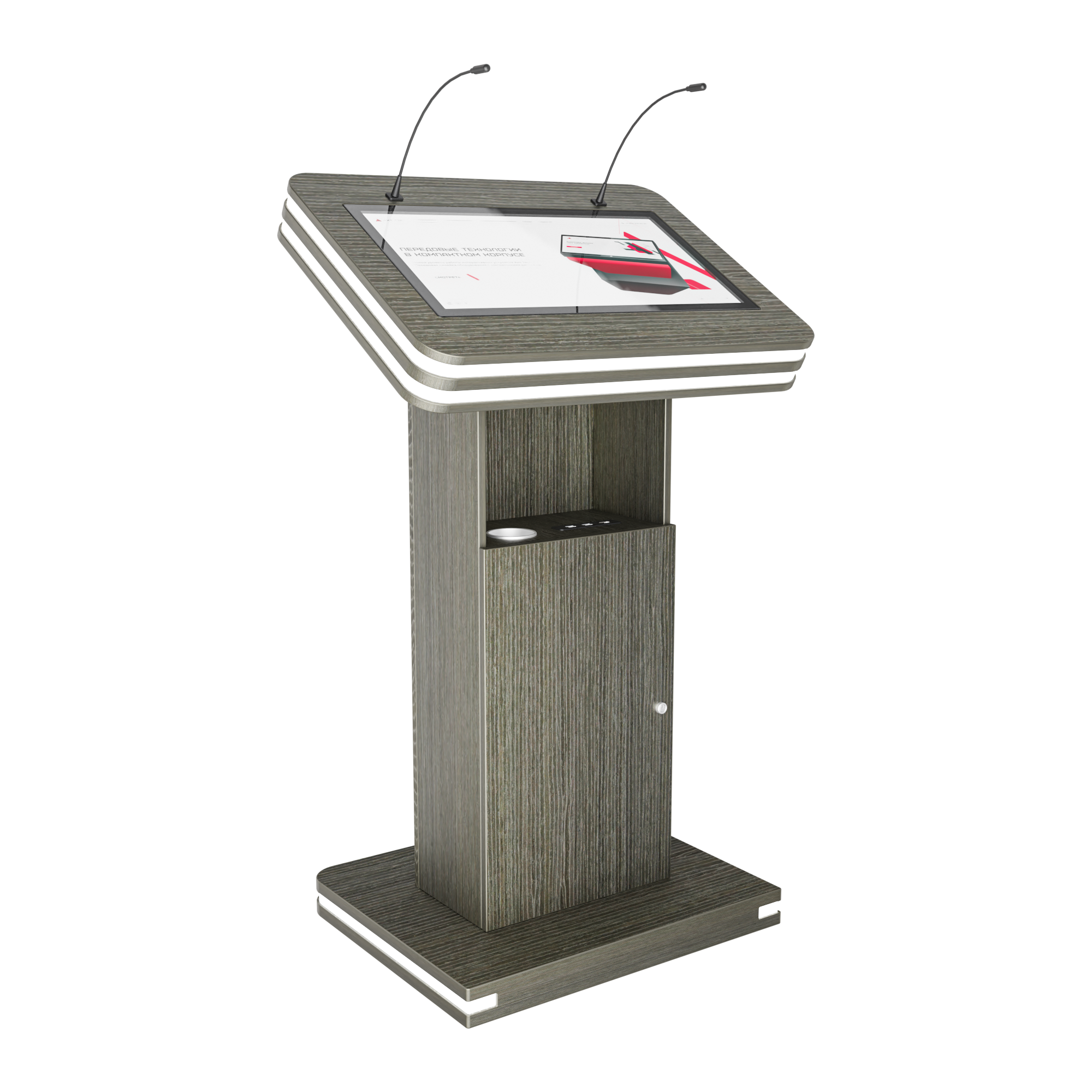 Интерактивная трибуна Light — стильная модель, которая украсит любой бизнес-форум и конференцию. Встроенные микрофоны передают звук на большую аудиторию, удобный интерактивный дисплей с мультитач-системой позволяет отображать необходимую информацию не только для спикера, но и для зрителей, передавая ее на большой экран. Помимо этого, в трибуне есть полочка для воды, а также внешние разъемы. Яркий дизайн корпуса со светодиодным узором не сможет оставить никого равнодушным.