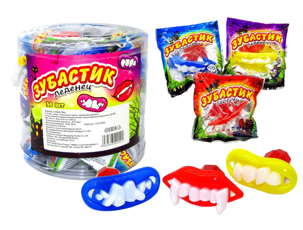 Карамель леденец «Зубастик» с фрутово-ягодными вкусами: клубника, тутти-фрутти и апельсин. Леденцы находятся в яркой индивидуальной упаковке, поэтому их удобно брать с собой. Особенность конфеты заключается в пластиковых зубах-страшилках, выполненной в виде соски. Съедобная часть — соска.