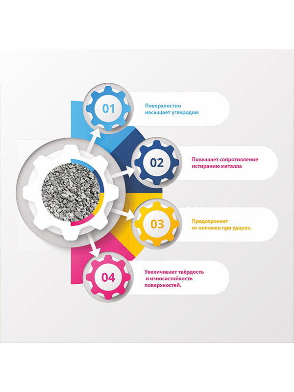 Используется в металлообрабатывающей промышленности для цементации металлических элементов. Благодаря ему создаётся высокая точность легирования материала. В отличие от обычных продуктов, он даёт повышенное усвоение углерода, это гарантирует отличное качество стального сплава. Применяется в