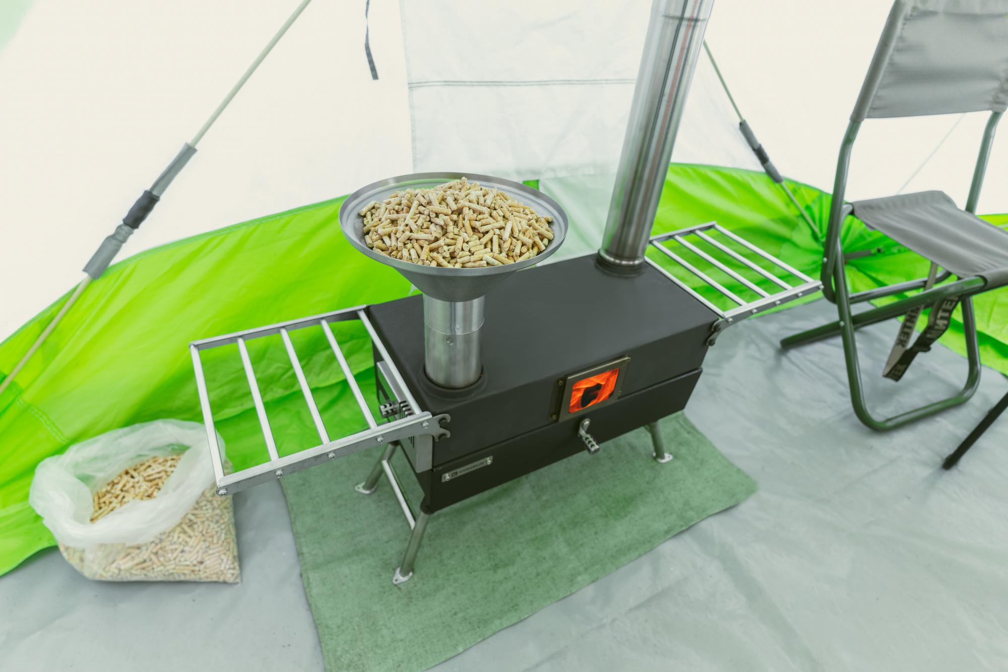 У печи два режима мощности, при этом возможна тонкая регулировка с помощью воздушной заслонки. Режим открытой заслонки предназначен для готовки, а также для обогрева палатки в экстремальные морозы. На закрытой заслонке печь выдаёт 2,5 кВт мощности, чего достаточно для обогрева палатки до 30м³. Если у вас высокая палатка, и высоты дымохода недостаточно, вы можете приобрести дополнительное колено дымохода. Также есть углы для палаток с боковым окном дымохода.