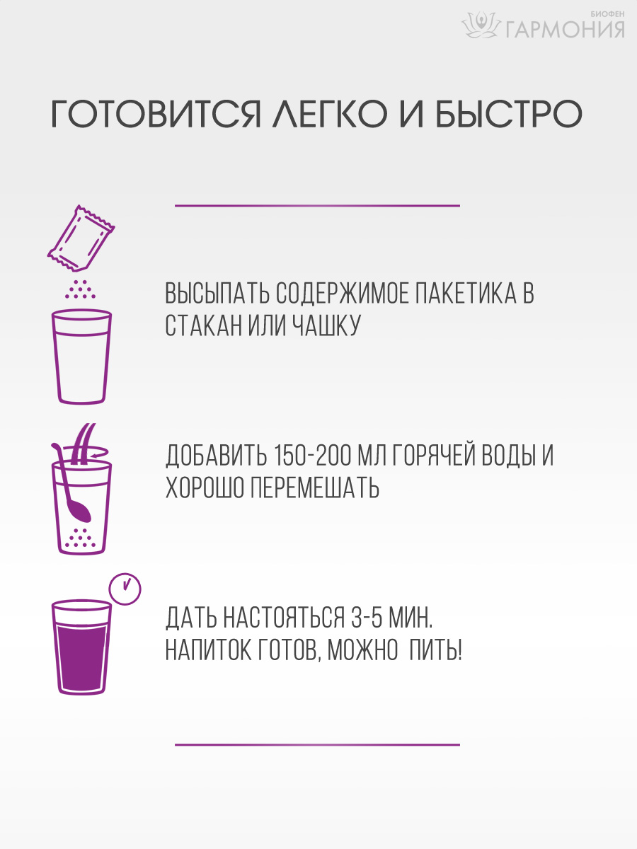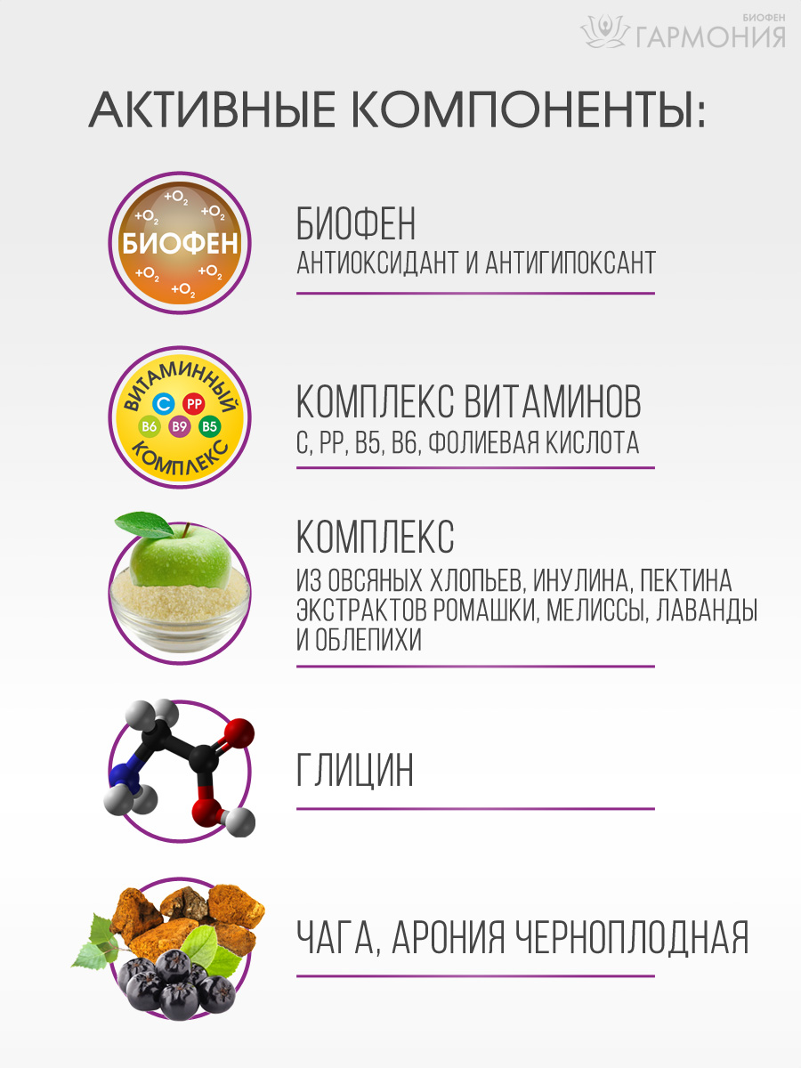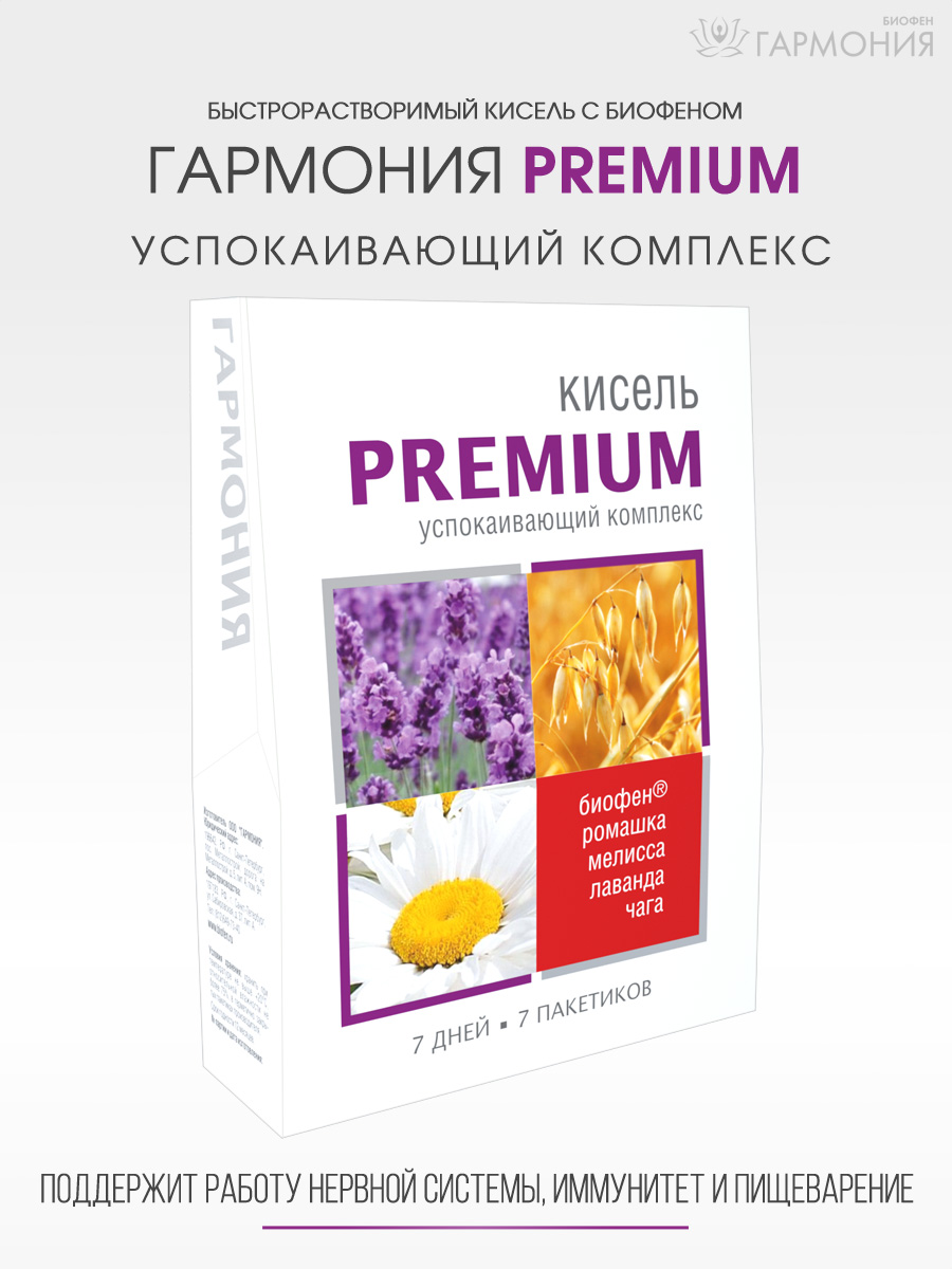 Сухой кисель «Гармония» PREMIUM – это вкусное и полезное лакомство, содержит успокаивающий, спазмолитический комплекс. Успокаивающий кисель поможет расслабиться, справиться со стрессом, поддержит работу нервной системы, иммунитета и пищеварения. Кисель содержит широкий спектр полезных для здоровья веществ. Кисель имеет богатую кисельную основу – это не только крахмал, но и овсяные хлопья, пектин и инулин. В состав успокаивающего напитка входят глицин, экстракты ромашки, мелиссы, лаванды, аронии, облепихи, чаги, комплекс витаминов и высокоэффективный антиоксидант-антигипоксант БИОФЕН®.