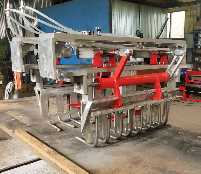 Клещевой захват для укладки мешков на поддоны промышленным роботом. Сделан под конвейер-рольганг, ролики диаметром 50мм, расстояние между роликами рольганга 75мм.