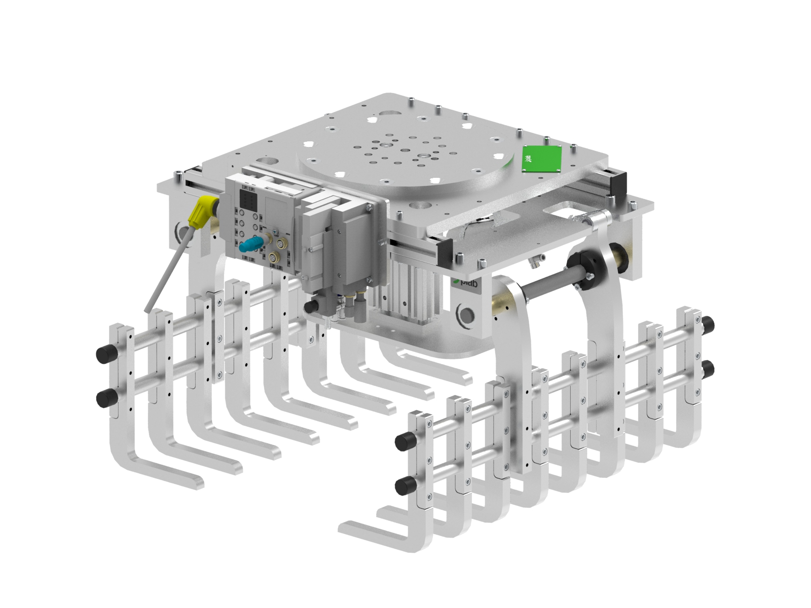Клещевой захват для укладки и паллетирования мешков со строительными смесями на поддоны промышленным роботом. Сделан под конвейер-рольганг, ролики диаметром 50 мм, расстояние между роликами рольганга 75 мм