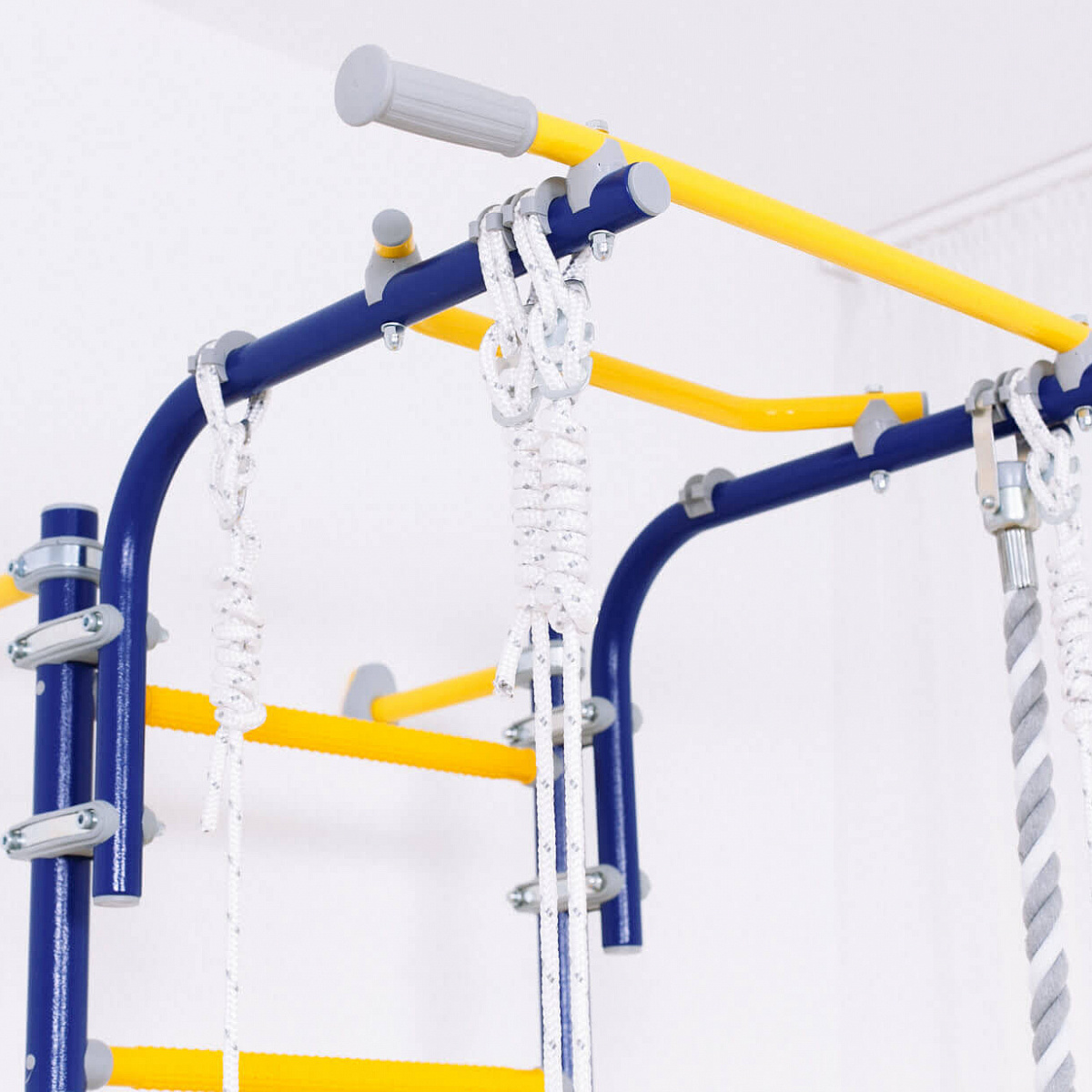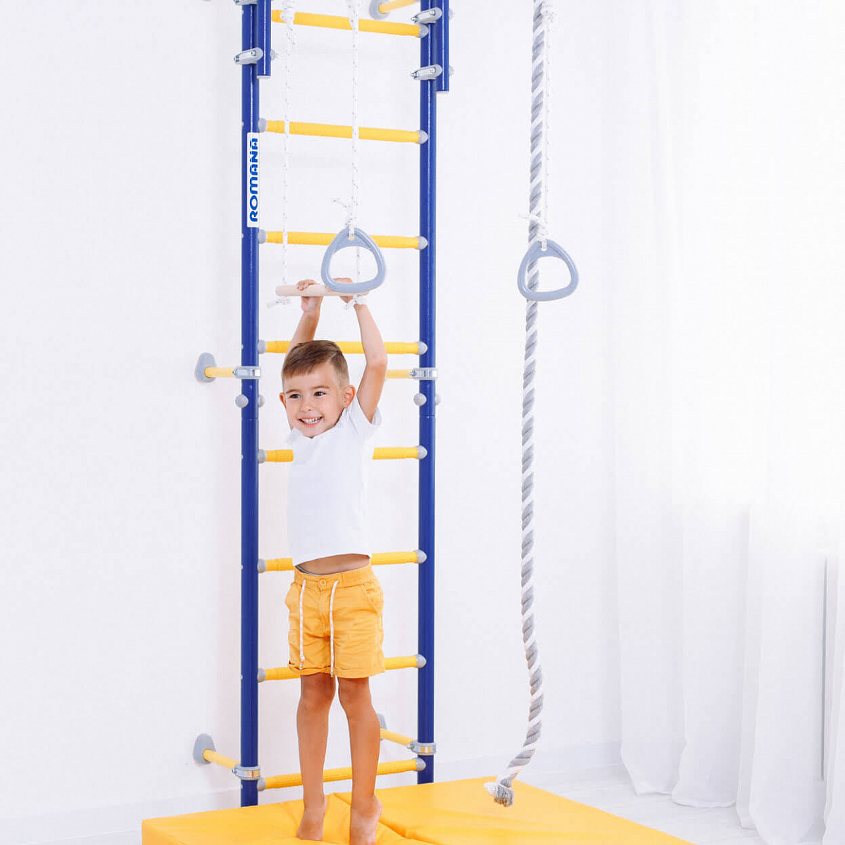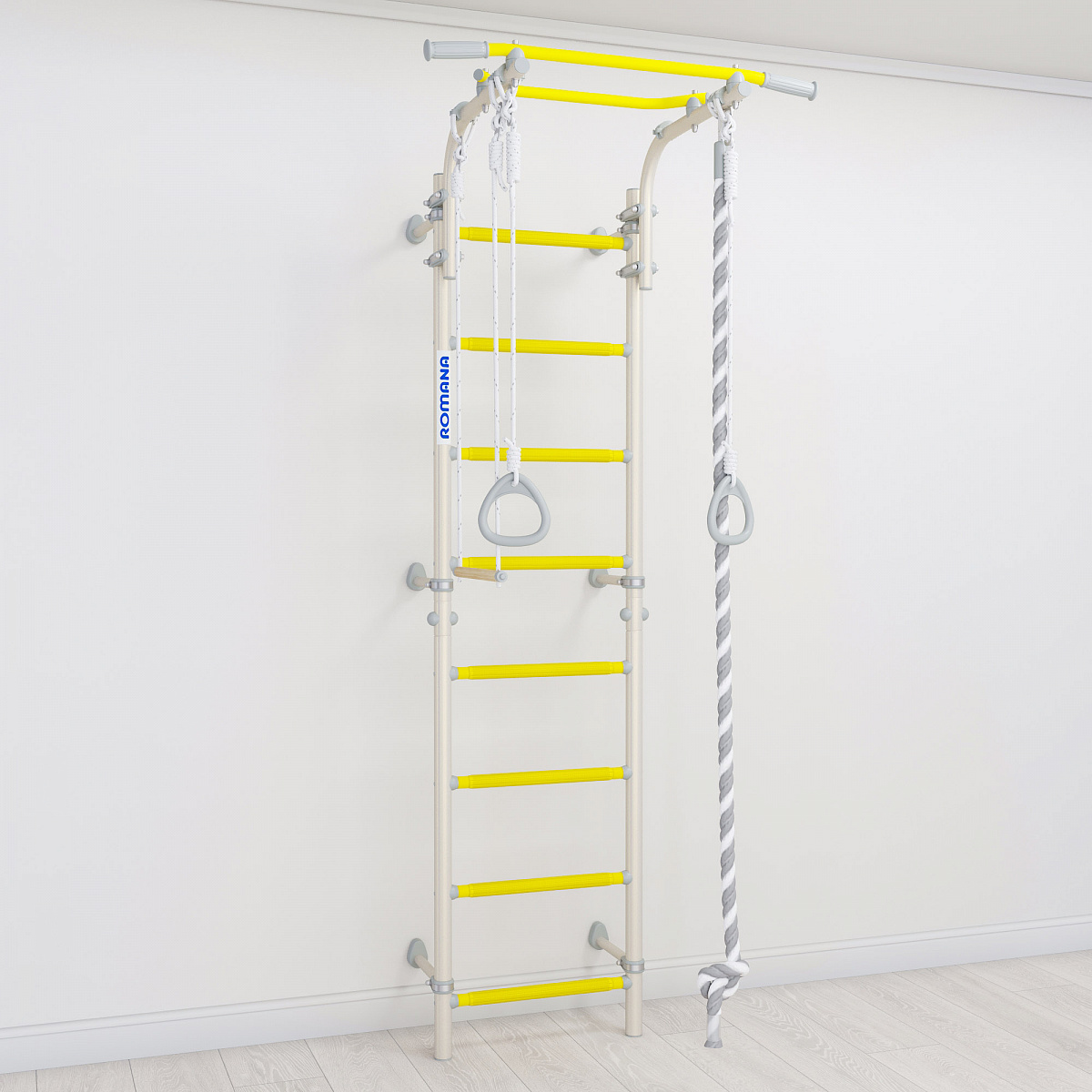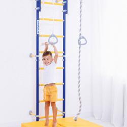 Детский спортивный комплекс ROMANA Next Top - настоящий хит в линейке шведских стенок. Он легко собирается и фиксируется к стене с помощью подвижных крепежей. Они позволяют зафиксировать стенку в различных положениях, включая угловое. Можно рационально расположить крепеж на той высоте, которая вас устроит, и избежать попадания в проводку или полости в стене. Одно из важных преимуществ этого ДСК - регулируемый турник, который фиксируется надежными хомутами. Его можно установить на лестнице на любую высоту. В зависимости от возраста ребенка, турник можно перевесить повыше или пониже. В комплексе ROMANA Next Top предусмотрены массажные ступени, которые хорошо развивают моторику и служат профилактикой плоскостопия. Также в комплекте идет навесное оборудование: кольца, трапеция и канат.