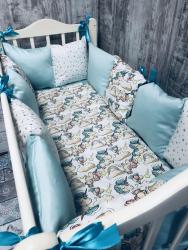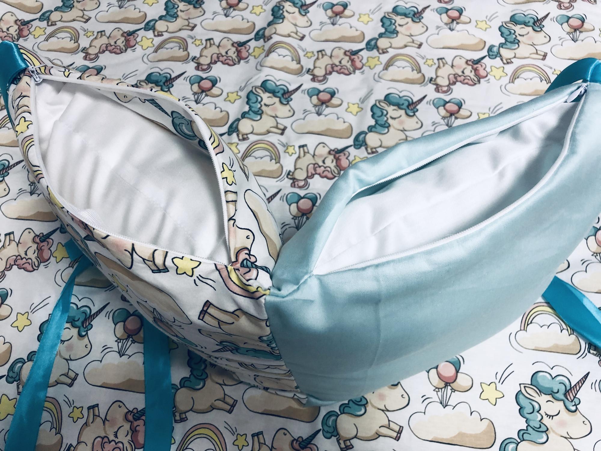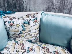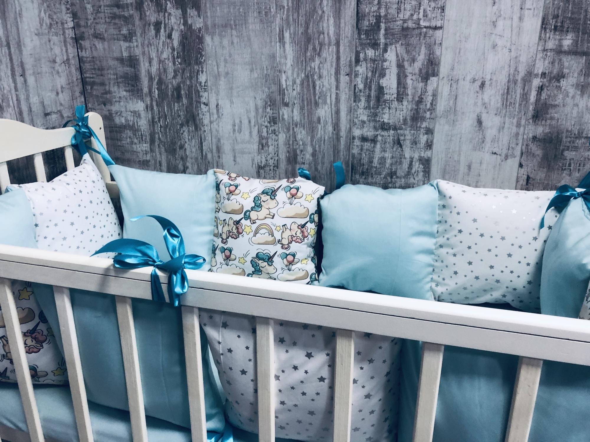 Наличие бортиков сильно упрощает жизнь молодых родителей,которые хотят обеспечить полную безопасность малышу:сохранят тепло в кроватке,предотвратят попадание ручек и ножек между прутьями,защитят от ударов об кроватку,а различные цвета и рисунки на бортиках положительно влияют на эмоциональное развитие крохи.Наши бортики полностью удовлетворят самых требовательных и взыскательных родителей:большой выбор принтов и только премиум материалы.Комплект "Единорожки" подойдет для круглой кроватки:наволочки и простыня изготовлены из сатина премиум качества,одеяло из премиального ранфорса,только 100% хлопок, наполнитель для подушек и одеяла-гипоаллергенный синтепух и валюметрик.Бортики с потайной молнией-все наволочки съемные,что значительно упростит уход и надолго сохранит внешний вид и форму в изначальном виде.Комплект:12 подушек (30х30см,6 подушек мятного цвета,3 подушки с серыми звёздами,3 подушки с принтом "единорожки"),простыня (мятного цвета,на резинке),одеяло (90х90см,принт "единорожки").