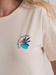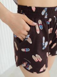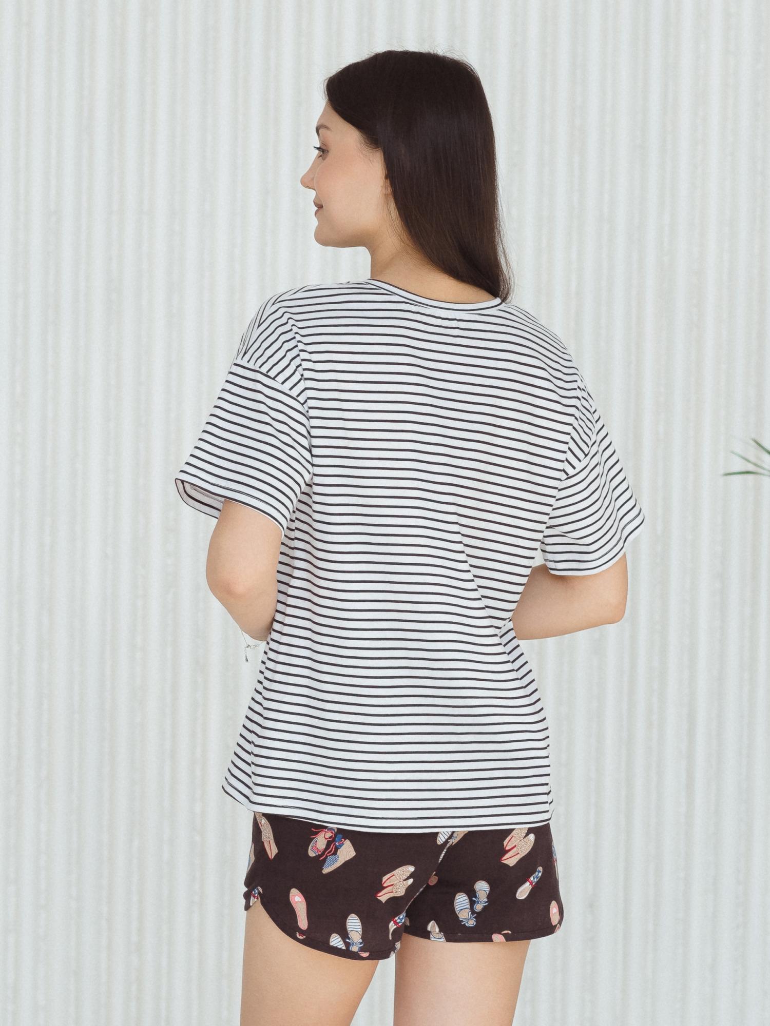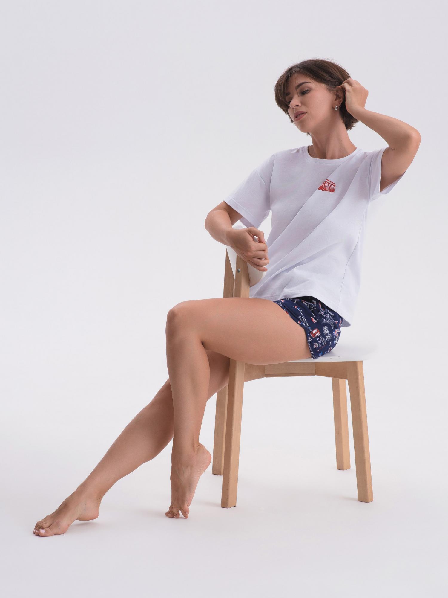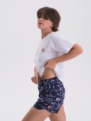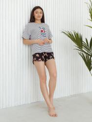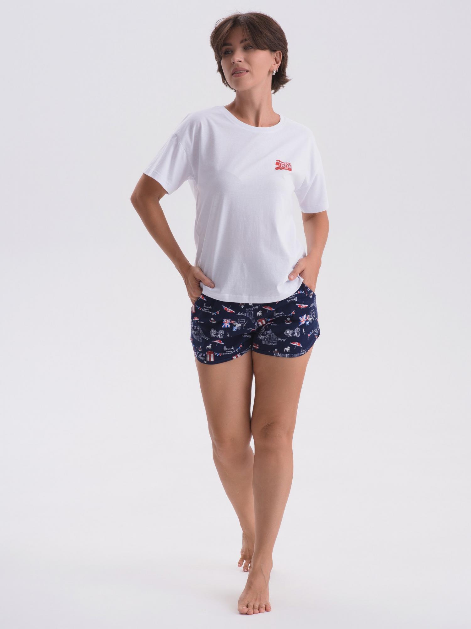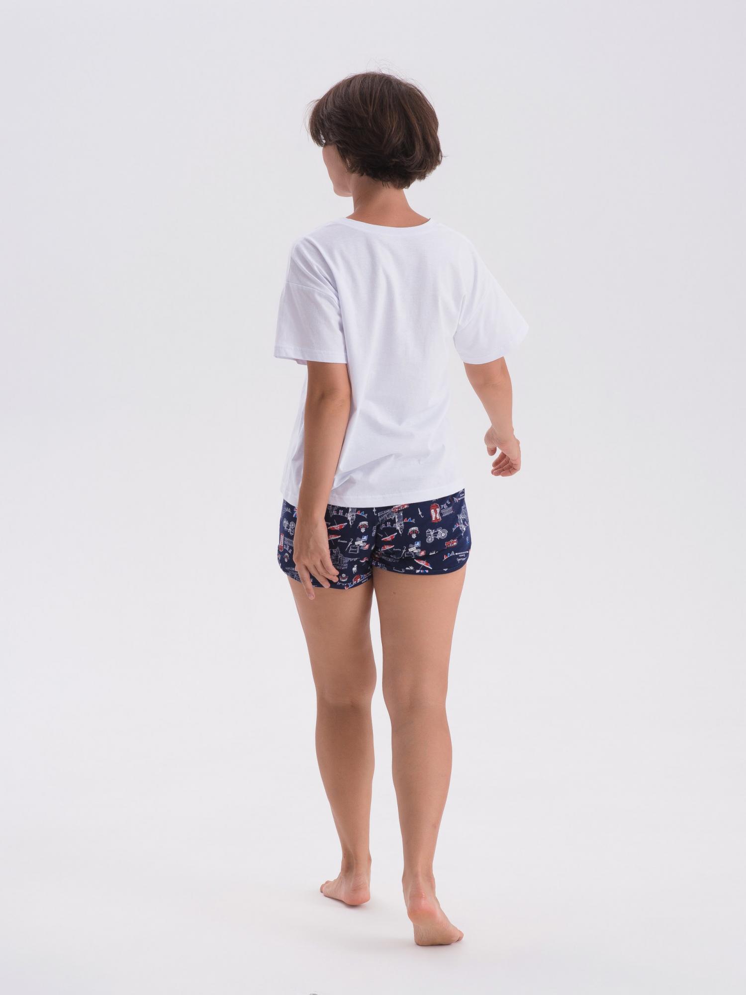 Пижама комбинированная состоит из футболки и шорт. Футболка из гладкоокрашенного полотна свободного кроя со спущенным плечом и втачным коротким рукавом. Горловина круглая, обработана притачной обтачкой из основного полотна. передняя половинка футболки декорирована принтом. Шорты из набивного полотна прямые с фигурным низом. Пояс притачной с эластичной тесьмой. Карманы наклонные с окантовкой по входу в карман в цвет основного полотна шорт. Низ оканотован в цвет основного полотна шорт.