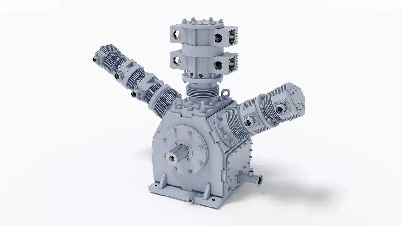 Четырехступенчатый компрессор, на трехрядной W-образной базе с усилием по штоку 3 тонны. Компрессор является полностью отечественной разработкой, что позволяет гарантировать постоянное наличие всех деталей и комплектующих на складе у производителя.